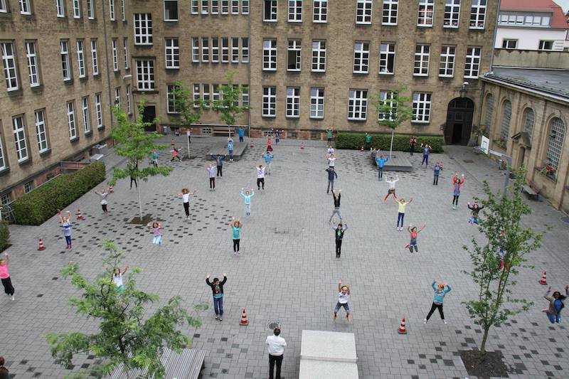 Als Fahrgäste bestiegen sie im Gedankenspiel zunächst einen Linienbus der Verkehrsbetriebe, in den sie mit 50 Personen ganz mühelos hineinpassten. Länge des Busses: Rund zwölf Meter, Platzbedarf rund 31 Quadratmeter. Um die Größen im Bild festzuhalten, wurden die Schüler in dieser Formation von oben fotografiert. Im Anschluss stiegen sie in Gedanken alle aufs elterliche Auto um. Der „Aha-Effekt“ bei diesem Experiment trat schnell ein. Denn, wenn man die bundesweit durchschnittliche Besetzungsquote von 1,2 Insassen berücksichtigt, dann wären rund 40 Pkw nötig, um alle Schüler befördern zu können. Die Autoschlange auf dem Weg zur Schule nähme dann selbst ohne den normalerweise eingehaltenen Sicherheitsabstand zwischen den einzelnen Pkw ganze 180 Meter in Anspruch. Im Vergleich zum Bus schneidet sie also richtig schlecht ab, was den Schülern mit dem Vergleichsfoto vor Augen geführt wurde. Noch drastischer fiele ein Vergleich mit der neuen Stadtbahn ET2010 aus, die mit einer Länge von 37 Metern bis zu 244 Personen in die Innenstadt befördern kann. 203 Pkw wären notwendig, um diese Menge an Personen zu befördern. Diese Pkw würden einspurig hintereinander fahrend eine Blechlawine von rund sechs Kilometern Länge erzeugen.