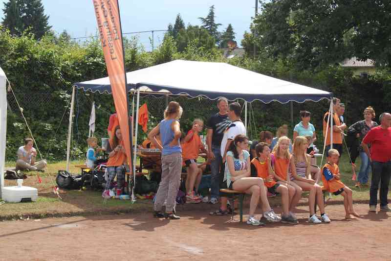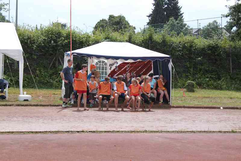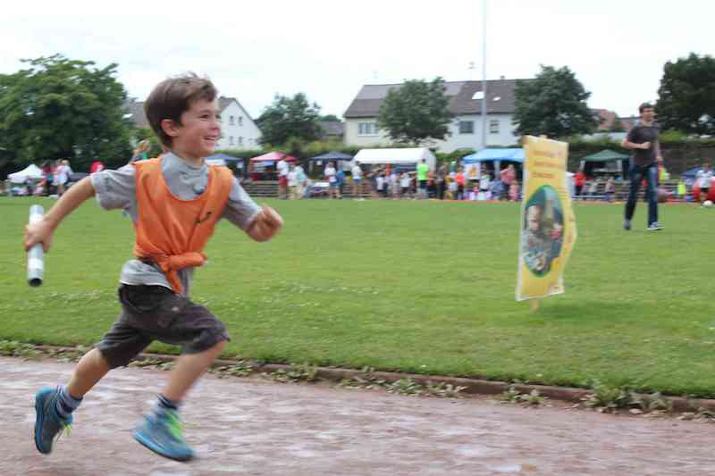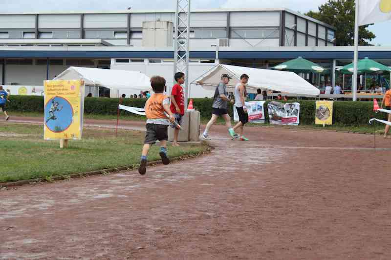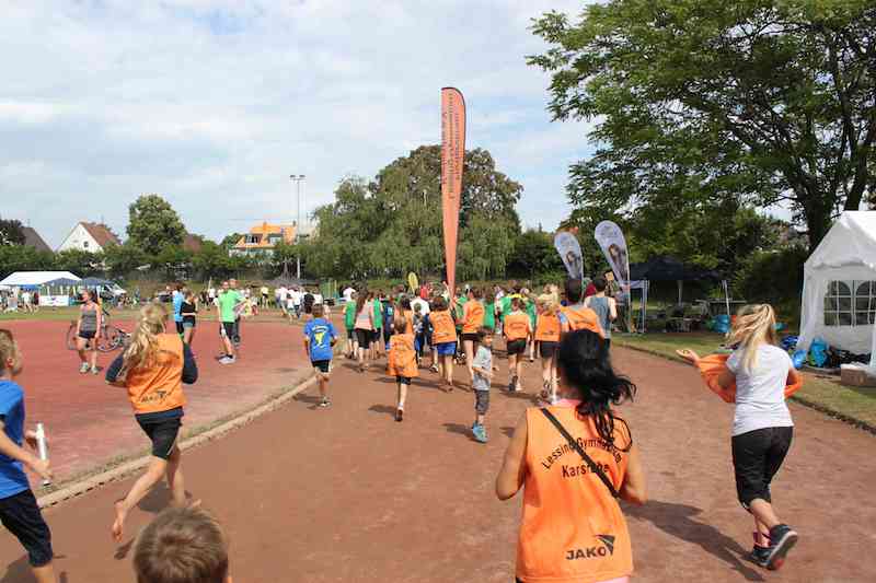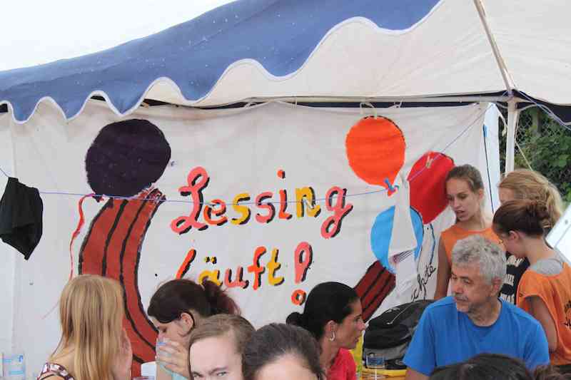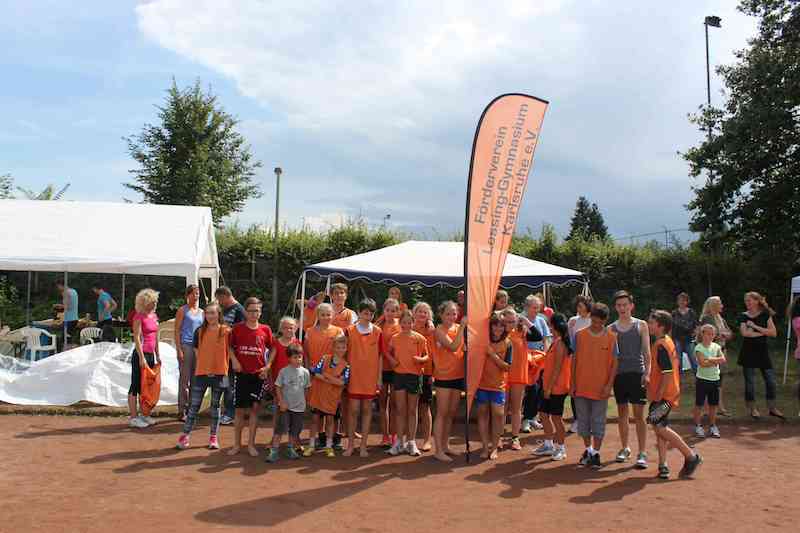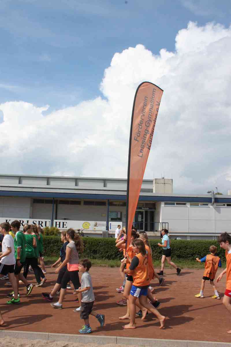 88 Schülerinnen und Schüler - so viele wie nie zuvor - hatten sich im Vorfeld für das Team „Lessing läuft“ angemeldet. Mit der Verstärkung einiger ehemaliger Abiturienten, etlicher Mamas und Papas sowie Geschwisterkinder und des ein oder anderen Lehrers schaffte es die Lessing-Gemeinschaft erneut unter die besten zehn Mannschaften beim diesjährigen 24h-Lauf für Kinderrechte. Insgesamt 815 Mal umrundeten die Orangefarbenen die Laufbahn, schlugen sich wacker gegen zwangsverpflichtete Schülermassen anderer Schulen, trotzten Regen, Blitz und Donner, bevor am Ende der zweite Platz nach Spendengeldern für das Lessing-Gymnasium stand. Insgesamt Euro 5762,60 spendeten Angehörige der Lessing-Gemeinschaft für Karlsruher Kinder, mehr als zehn Prozent der Gesamtsumme aller erlaufenen Spenden. Ein herzliches Dankeschön geht an alle Unterstützer dieser gelungenen Veranstaltung, die entweder als Spender, als Läufer oder als Helfer am Lessing-Stand den 24h-Lauf für Kinderrechte zu einem kleinen Schulfest werden ließen.