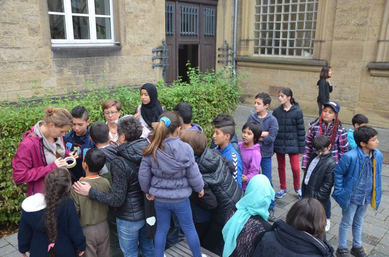 Wir sind für die Preise verantwortlich und haben uns überlegt, dass jedes Kind eine schön verpackte Tafel Schokolade und eine selbst gemachte Urkunde von uns bekommt. Unsere Urkunde ist extra auf Deutsch und Arabisch verfasst und wurde von allen Mitschülern unterschrieben. Eigentlich rechnen wir mit dreißig Flüchtlingskindern, es stellt sich jedoch heraus, dass mehr Kinder kommen als erwartet. Also ist jemand von uns mit dem Fahrrad noch mehr Schokolade kaufen gegangen.