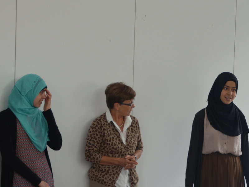 Unsere Gruppe war für die Verständigung zwischen den Schülern und den arabischsprachigen Flüchtlingskindern zuständig. Damit wir uns mit den Kindern ein wenig verständigen können, stellen wir im Vorfeld eine Liste wichtiger Wörter auf Arabisch und Deutsch zusammen. Kadije übersetzt die Wörter und zudem helfen uns ihre große Schwester Sheeima (9c) und deren Freundin Asmaa (9c) tatkräftig. Dank unseres Mini-Lexikons können wir die Kinder auf Arabisch begrüßen, uns vorstellen und einige weitere Dinge sagen. Am Samstag vor der Veranstaltung haben Kadije, Asmaa, Sheeima und Hanna (9c) die Kinder in ihrer Unterkunft in der Kriegsstraße 200 über das Sportfest informiert. Es kommen 33 Kinder zwischen 4 und 15 Jahren zusammen. Am darauffolgenden Montag holt das Sprach-Team gemeinsam mit einigen anderen Mitschülern die Kinder ab und bringt sie zur Schule. Alle Schüler kümmern sich um die Kinder und wir verständigen uns auf arabisch, türkisch, englisch, deutsch und mit Händen und Füßen. So klappt die Kommunikation überraschend gut. Gibt es doch Verständigungsprobleme, helfen unsere Übersetzerinnen allen Stellen und dolmetschen bei der Siegerehrung für Frau Lenz und bei der Verabschiedung beim Essen für Frau Schatte.