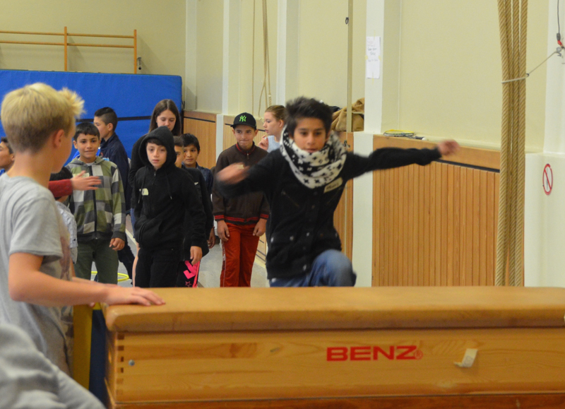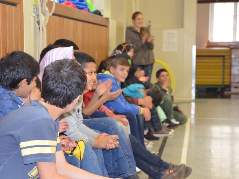 Als Sportgruppe haben wir die Aufgabe einen Sportparcours für die Flüchtlingskinder in der Lessing-Sporthalle vorzubereiten und aufzubauen. Nachdem wir in der vorherigen Woche zehn Stationen geplant haben, können wir am Tag des Festes gegen 8:30 Uhr mit dem Aufbau beginnen, während sich die anderen Klassenkameraden auf den Weg in die Kriegsstraße 200 machen, um die Kinder abzuholen.