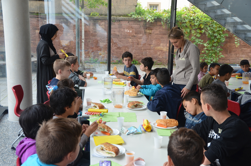 Die Essensgruppe der Klasse hat die Aufgabe das Essen für das Sportfest zu planen. Eine Woche vor dem Treffen sprechen wir alles genau durch. Bei unseren Überlegungen denken wir über die Religionen der Kinder nach und recherchieren, was sie ihrer Heimat normalerweise essen. Am Ende steht ein Essensplan fest: Fladenbrot mit Joghurt, Gurke, Tomaten und Falafel und zum Nachtisch gibt es Kuchen. Wir entscheiden, dass wir alle gemeinsam – also ca. 65 Leute – in unserer Schulmensa essen wollen.