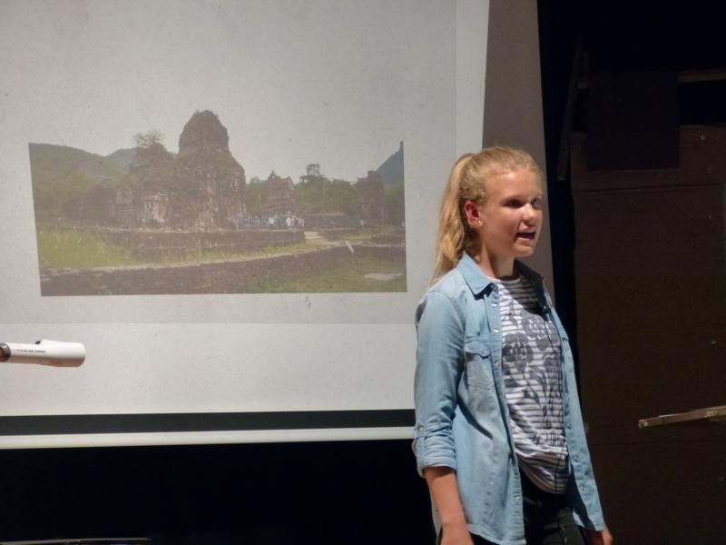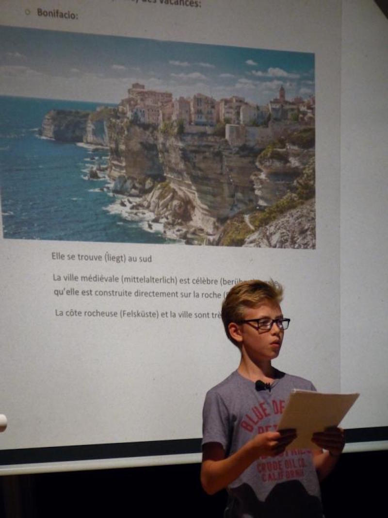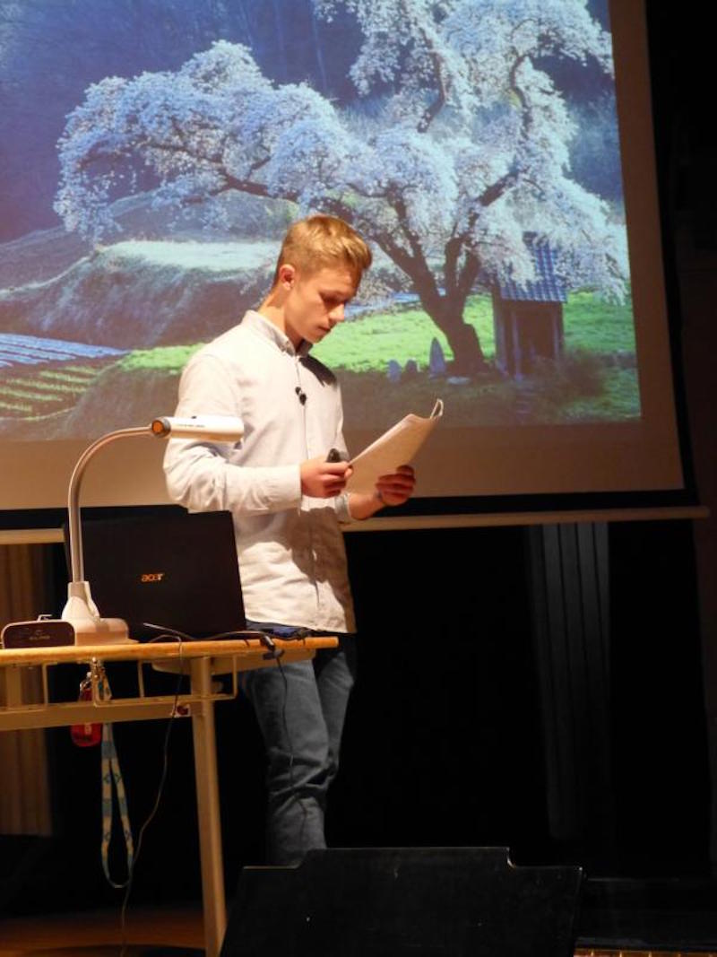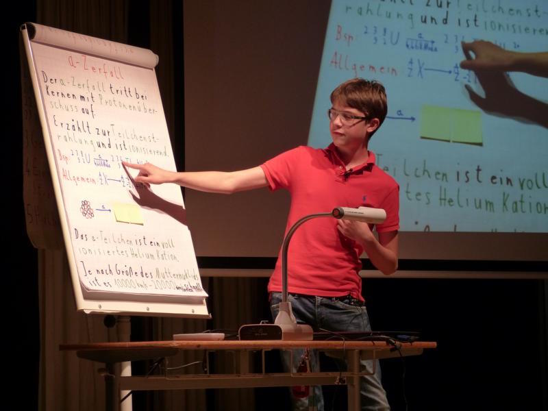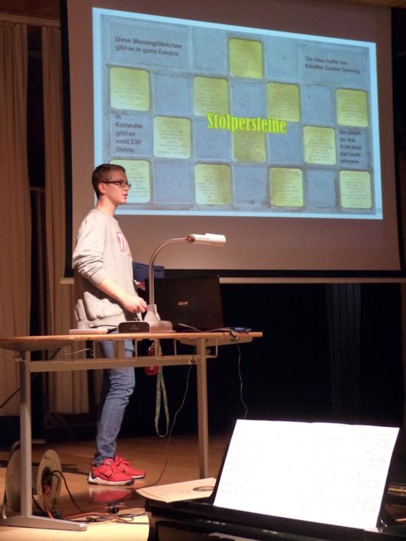 „5x5“ – so lautete am Dienstag, dem 14. Juni 2016 das Motto der diesjährigen Aula Lessing: Fünf Schülerinnen und Schüler waren aufgerufen, ihre jeweilige Jahres-GFS auf der Bühne des Lessing-Gymnasiums einem breiten Publikum aus Schülern, Eltern sowie Lehrern zu präsentieren. Dass dieses vorausgeschickte Motto tatsächlich einen solchen Mehrwert an Erkenntnissen, Persönlichkeiten sowie anekdotenreichen Vorträgen hervorbringen könnte, war die Hoffnung der Veranstalter gewesen. Die sperrige „gleichwertige Feststellung einer Schülerleistung“ sollte aus dem eingeengten Rahmen des Klassenzimmers herausgeholt werden, die anschaulichsten und interessantesten der zumeist als Referat gehaltenen Pflichtpräsentationen sollten auch als Kür der Aufklärung in einem größeren Forum dargeboten werden dürfen. Nach der Verleihung des diesjährigen Sozialpreises durch Frau Schatte zu Beginn der Veranstaltung konnten etwa 50 Schüler, Lehrer und Eltern Zeuge von fünf sehr kurzweiligen, lehrreichen und vor allem auch persönlich gefärbten Vorträge werden. Einleitend startete Luca Kob mit einer ursprünglich in Geographie gehaltenen GFS über Vietnam und den tropischen Regenwald, in der sie äußerst charmant auch eigene Erfahrungen aus dem Land präsentierte. Der zweite Vortrag des Abends stand im Zeichen der Naturwissenschaft: Vincent Skrobocz aus der 8a breitete am Flipchart in der Manier eines Nachwuchswissenschaftlers die chemischen Grundlagen der Radioaktivität aus und forderte so manchem Zuhörer eine Höchstmaß an Konzentration ab. Letztere blieb aufgrund eines sehr emotionalen Erlebnisberichts eines Hiroshima-Opfers bei der darauffolgenden Darbietung auf höchstem Niveau erhalten: Hannes Becker las in englischer Sprache einen Auszug daraus als Einstieg in sein Thema „the atomic bomb“. Sehr berührend führte der Jahrgangsstufenschüler in seinem weiteren Vortrag den schrecklichen Missbrauch von Naturwissenschaft im Dienste einer Zerstörungsmaschinerie vor Augen. Auch im vierten Vortrag des Abends konfrontierte Dejan Kasic aus der Klasse 9a die Aula-Gäste mit der dunklen Seite menschlicher Existenz. Er nahm seine Zuschauer mit auf eine sehr gut recherchierte Bilderreise durch Karlsruhe und spürte darin Spuren des Nationalsozialismus in seiner Heimatstadt am Beispiel von Straßen und Gebäuden auf. Nach diesen dunklen Kapiteln bildete ein wahrer Lichtblick den Abschluss des Abends: Casimir Zoch berichtete über eine Perle unter den Mittelmeerinseln, über Korsika - als Siebtklässler in französischer Sprache wohlgemerkt. Versüßt wurde der Abend nicht nur durch den von Casimir mitgebrachten korsischen Honig. So spielten zwischen den Vorträgen Schülerinnen und Schüler unter der Leitung von Herrn Draheim ausgewählte Musikstücke auf der Querflöte (Lena Seitz, JS 11) sowie auf der Violine (Angelo Müller, JS 11), bevor am Ende der Schüleraula der Chor mit dem Titel „Alles nur geklaut“ von den Prinzen etwas ironisch auf die, zwingend vorgeschriebene, seriöse Quellensuche sowie Zitierpraxis bei der Ausarbeitung eines GFS-Themas hinwies.