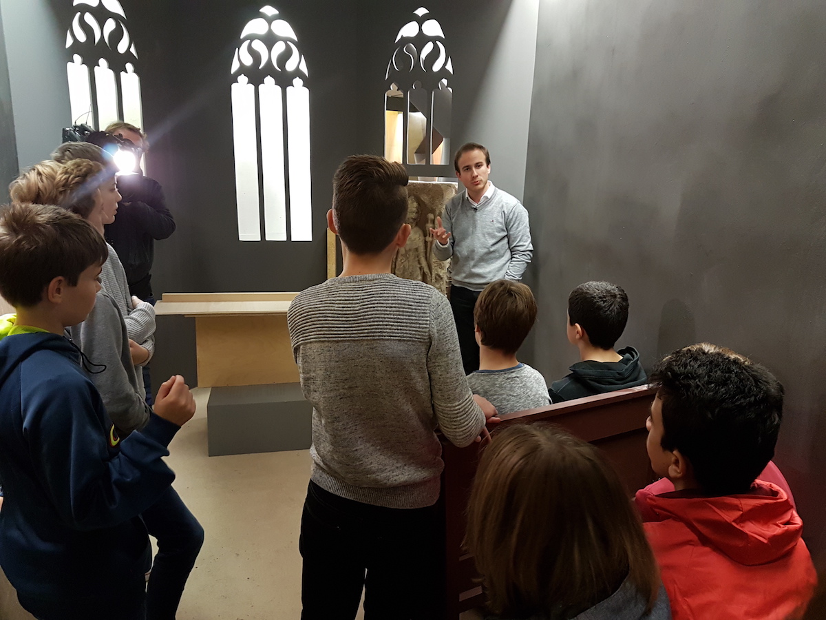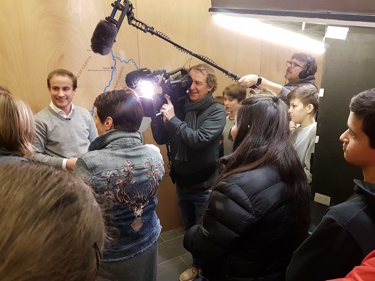 Der Dreh verlief spannend. Die sympathische Projektleiterin Sonja Faber-Schrecklein wies unsere Schülerinnen und Schüler in ihre Aufgaben ein und, begleitet von Kameras und Mikrofonen, die über uns schwebten, durchquerten wir unter Führung von Jeff Klotz die Museumsräumlichkeiten, lauschten fasziniert seinen Erzählungen und betrachteten die zahlreichen Ausstellungstücke.