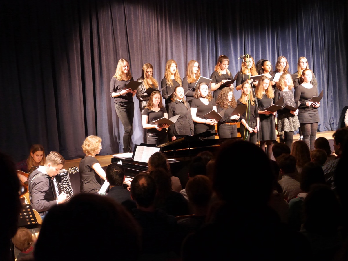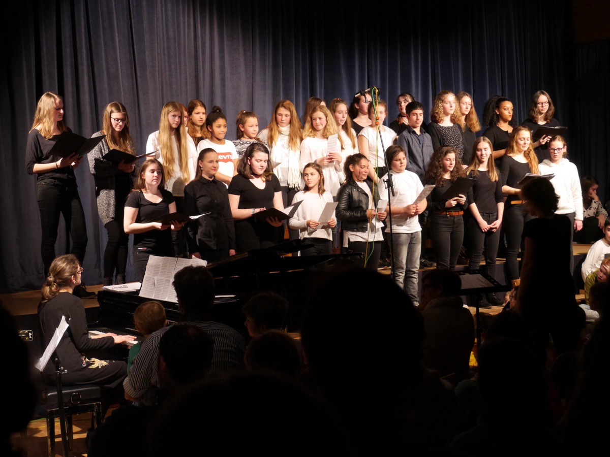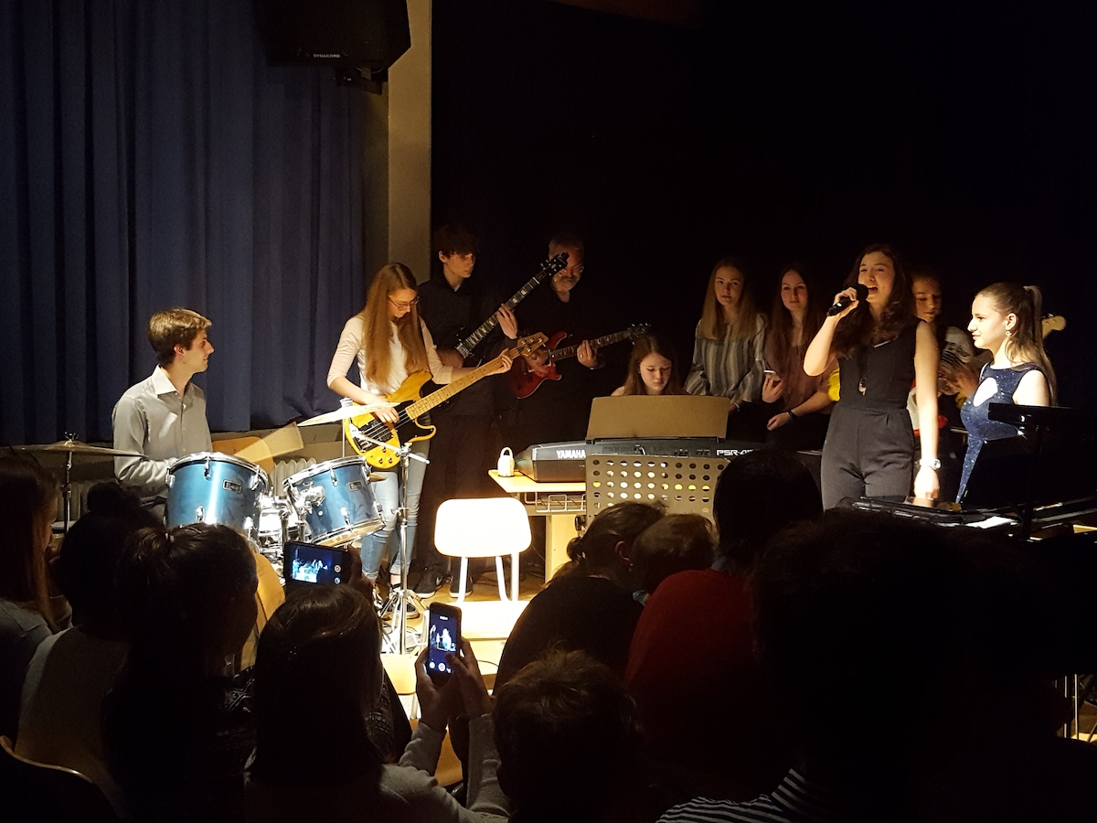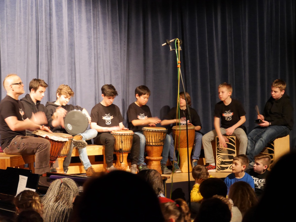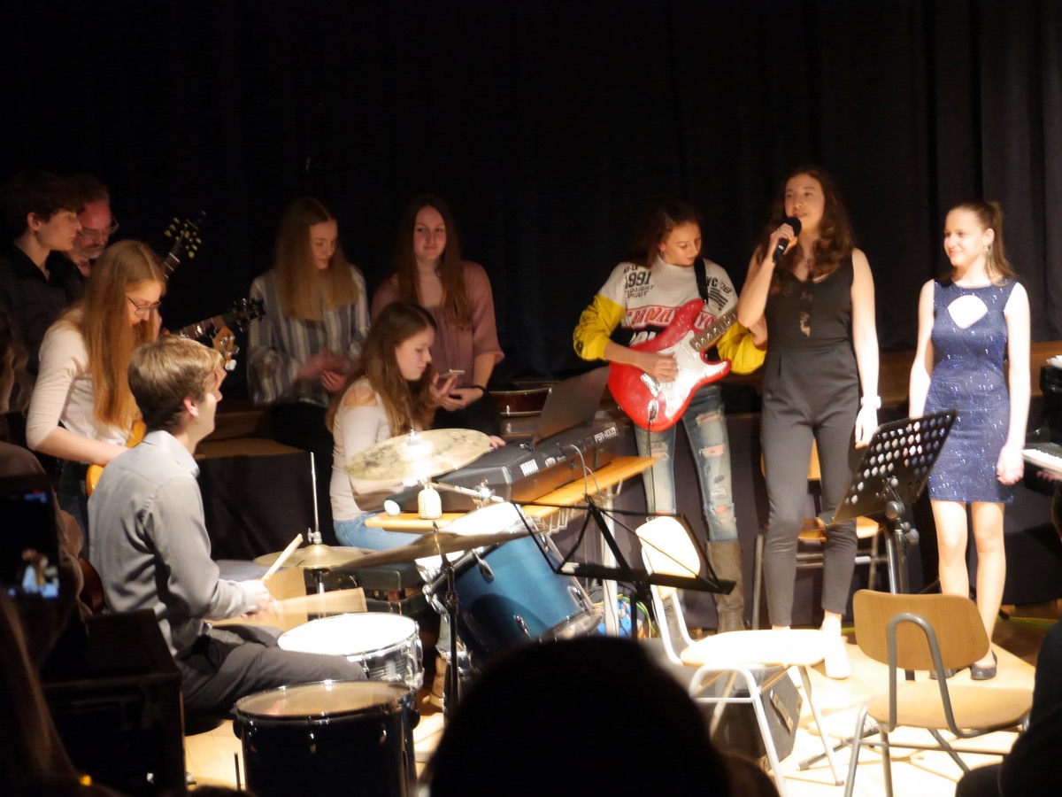 Dieser Einladung waren viele Interessierte gefolgt, so dass die Aula der Schule an die Grenzen ihrer Aufnahmekapazität gelangte. Die Neugierde selbst indes wurde überaus reich belohnt. In wechselnden Gruppierungen führten Konzertierende aller Altersgruppen auf unterschiedlichen Wegen durch Harmonien und Rhythmen verschiedenster Stilrichtungen. Von Vivaldi bis Sting, von Bearbeitungen klassischer Vorlagen über Kinderlieder bis zu Musical-Melodien und Rock-Stücken wurde mit Begeisterung und Freude musiziert, was sich unmittelbar auf das Publikum im Saal übertrug. Im Einzelnen engagierten sich hierbei: die Band (T. Gerstner), die Klassen 5c (K. Porzner) und 5d (T. Gerstner), die Trommel-Rhythmik-AG (Ch. Fritz), der Unterstufenchor (P. Bieringer) und der Rock-Pop-Jazz-Chor (C. Mark). So ließen sich mit einem kurzweiligen eineinhalbstündigen Programm die Zuhörer in einen ungemein lebendigen Abend geleiten, der mit seiner beschwingt vorgetragenen Musik einen lange anhaltenden Nachklang erzeugte.