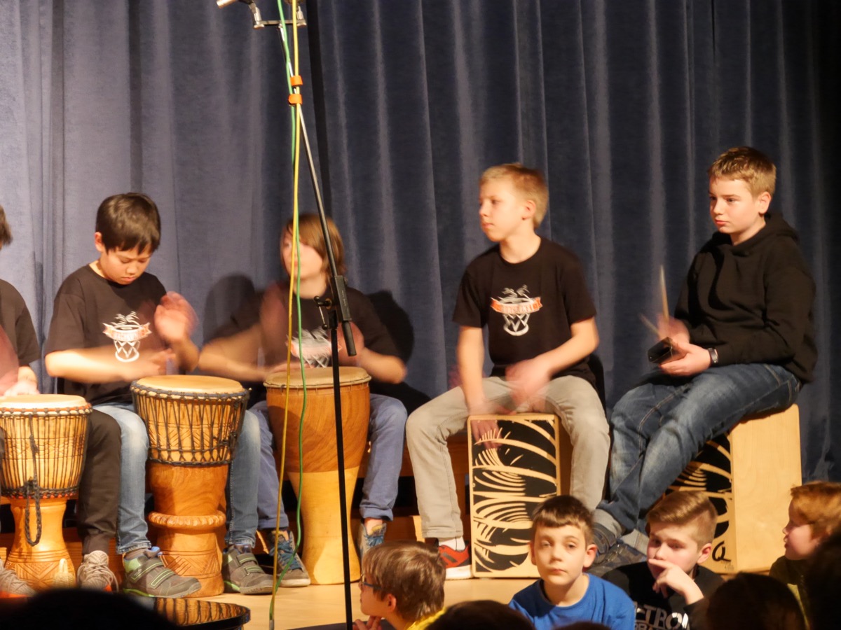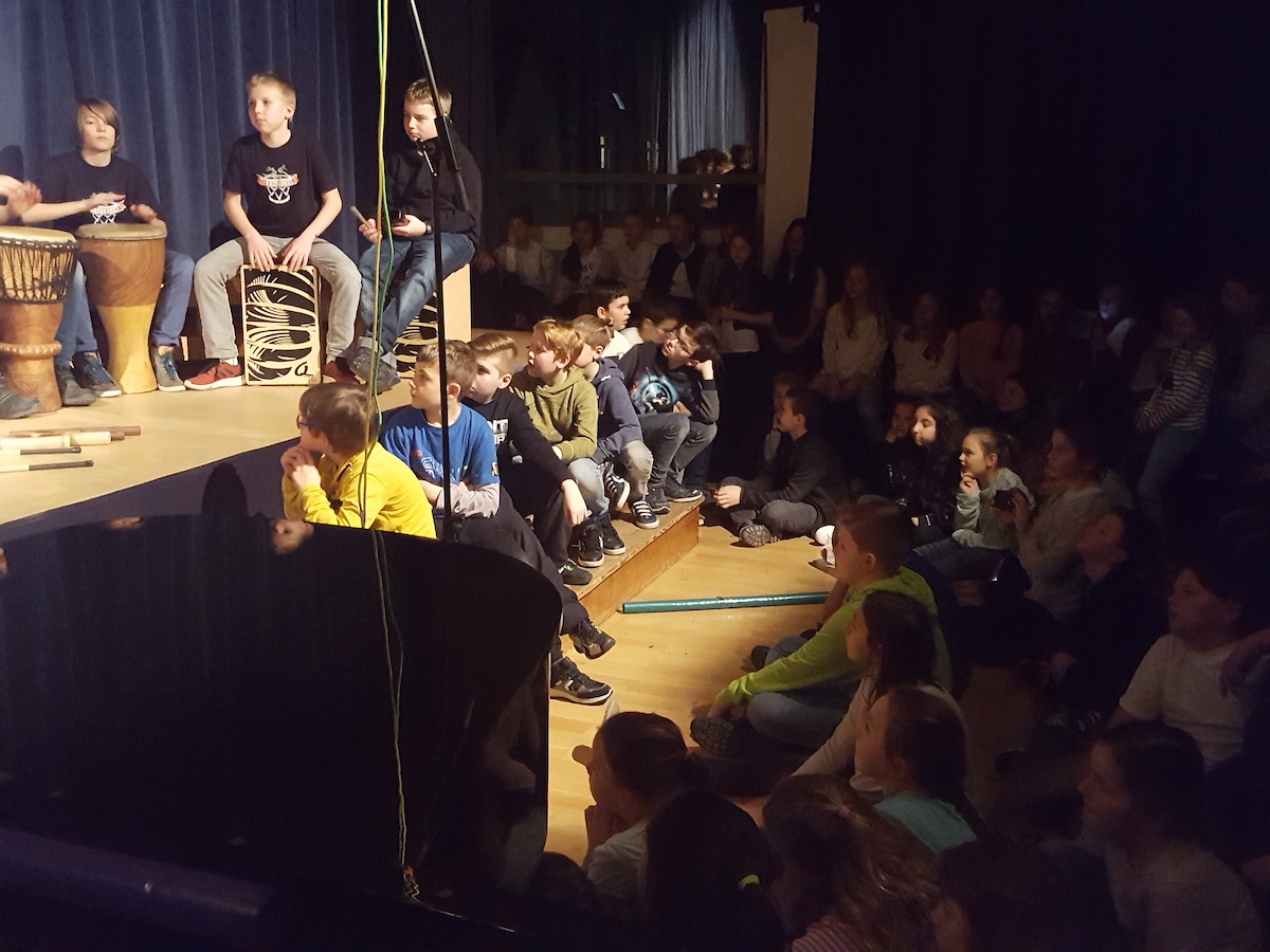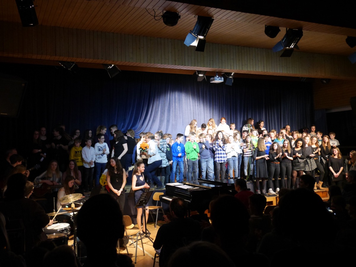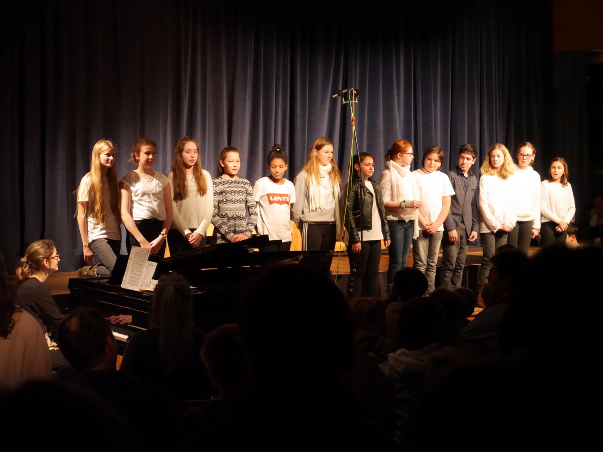 Dieser Einladung waren viele Interessierte gefolgt, so dass die Aula der Schule an die Grenzen ihrer Aufnahmekapazität gelangte. Die Neugierde selbst indes wurde überaus reich belohnt. In wechselnden Gruppierungen führten Konzertierende aller Altersgruppen auf unterschiedlichen Wegen durch Harmonien und Rhythmen verschiedenster Stilrichtungen. Von Vivaldi bis Sting, von Bearbeitungen klassischer Vorlagen über Kinderlieder bis zu Musical-Melodien und Rock-Stücken wurde mit Begeisterung und Freude musiziert, was sich unmittelbar auf das Publikum im Saal übertrug. Im Einzelnen engagierten sich hierbei: die Band (T. Gerstner), die Klassen 5c (K. Porzner) und 5d (T. Gerstner), die Trommel-Rhythmik-AG (Ch. Fritz), der Unterstufenchor (P. Bieringer) und der Rock-Pop-Jazz-Chor (C. Mark). So ließen sich mit einem kurzweiligen eineinhalbstündigen Programm die Zuhörer in einen ungemein lebendigen Abend geleiten, der mit seiner beschwingt vorgetragenen Musik einen lange anhaltenden Nachklang erzeugte.