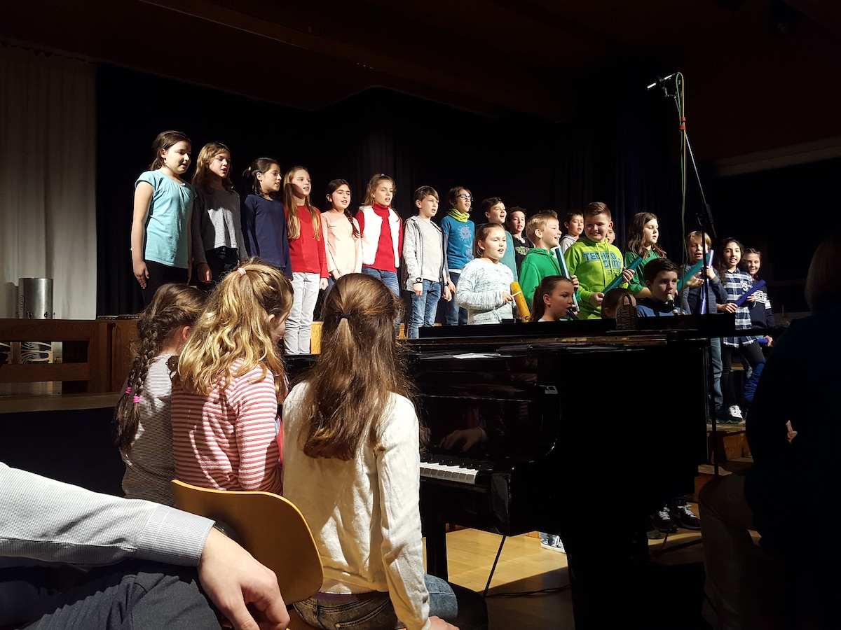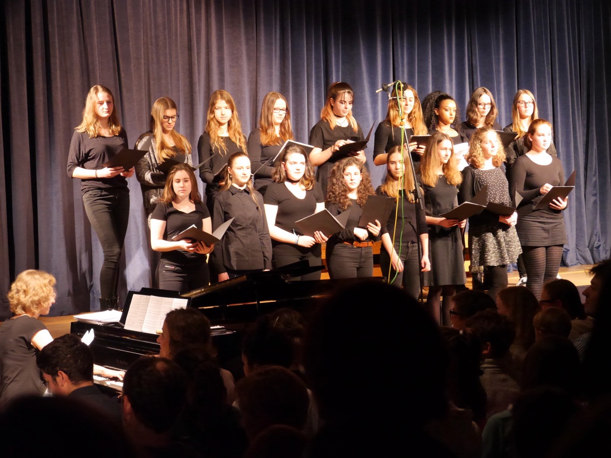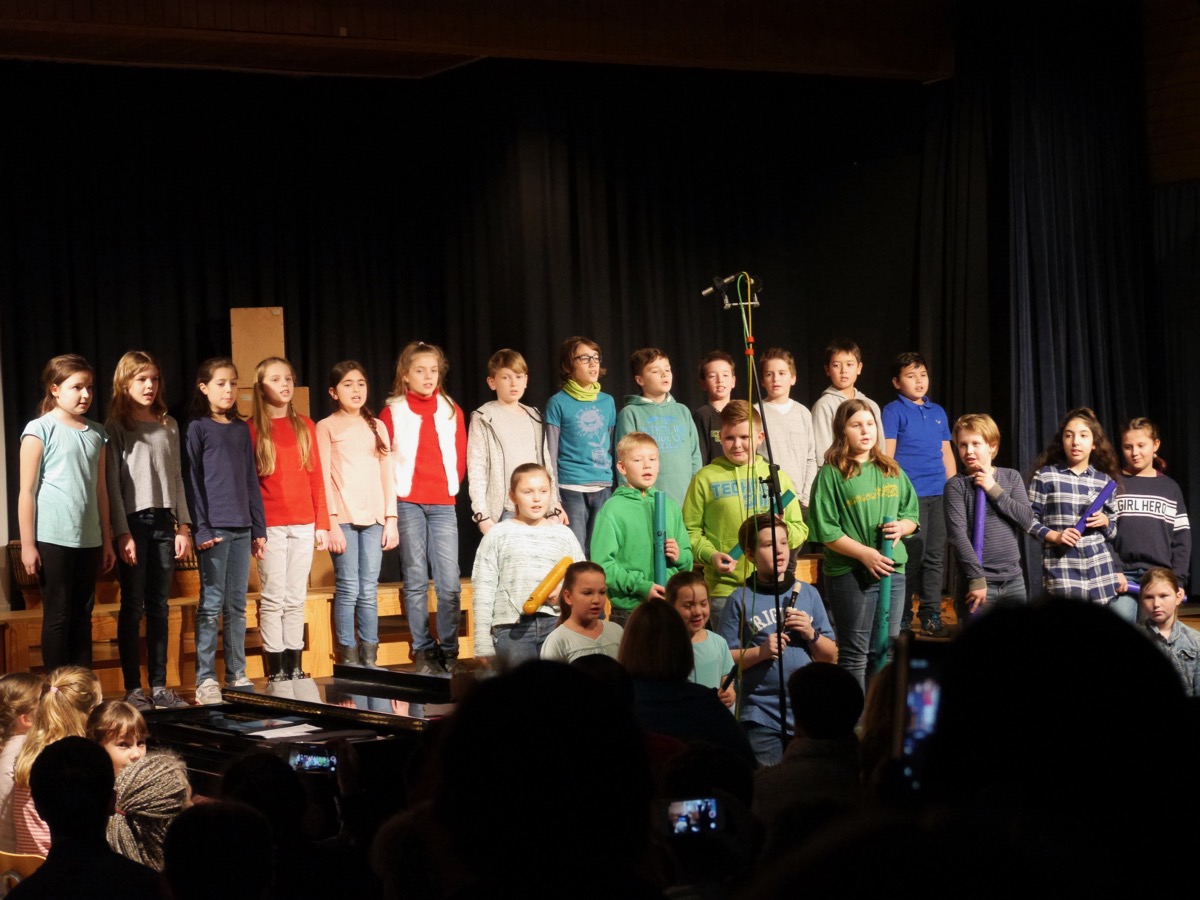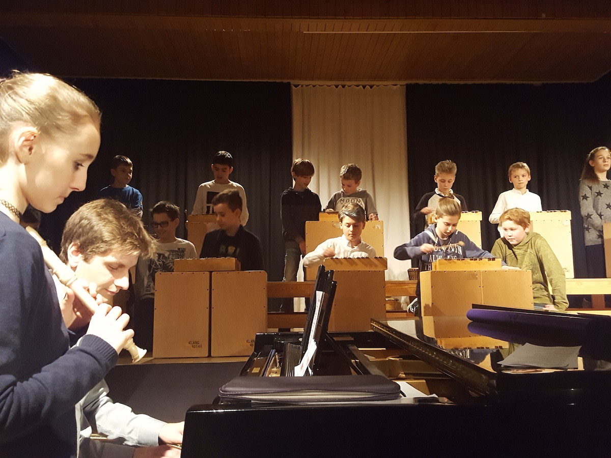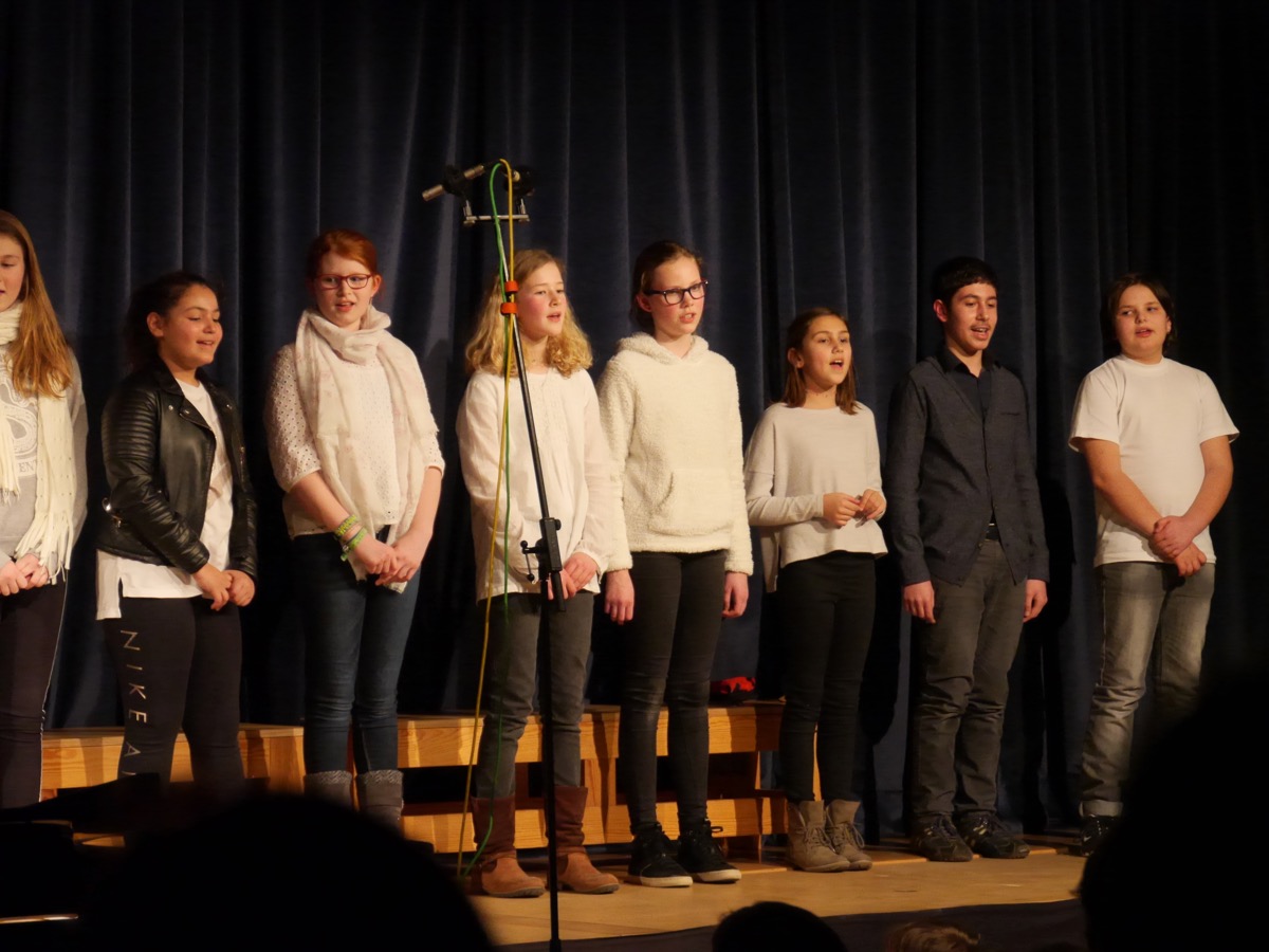 Dieser Einladung waren viele Interessierte gefolgt, so dass die Aula der Schule an die Grenzen ihrer Aufnahmekapazität gelangte. Die Neugierde selbst indes wurde überaus reich belohnt. In wechselnden Gruppierungen führten Konzertierende aller Altersgruppen auf unterschiedlichen Wegen durch Harmonien und Rhythmen verschiedenster Stilrichtungen. Von Vivaldi bis Sting, von Bearbeitungen klassischer Vorlagen über Kinderlieder bis zu Musical-Melodien und Rock-Stücken wurde mit Begeisterung und Freude musiziert, was sich unmittelbar auf das Publikum im Saal übertrug. Im Einzelnen engagierten sich hierbei: die Band (T. Gerstner), die Klassen 5c (K. Porzner) und 5d (T. Gerstner), die Trommel-Rhythmik-AG (Ch. Fritz), der Unterstufenchor (P. Bieringer) und der Rock-Pop-Jazz-Chor (C. Mark). So ließen sich mit einem kurzweiligen eineinhalbstündigen Programm die Zuhörer in einen ungemein lebendigen Abend geleiten, der mit seiner beschwingt vorgetragenen Musik einen lange anhaltenden Nachklang erzeugte.
