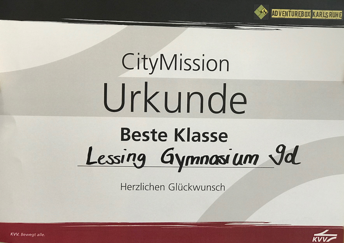 Der KVV führt in Zusammenarbeit mit der Adventure Box einmal im Jahr die CityMission durch. Unsere Klasse 9d hat mitgemacht und die Mission als beste Karlsruher Klasse abgeschlossen. Herzlichen Glückwunsch! Die Urkunde finden Sie im Folgenden.