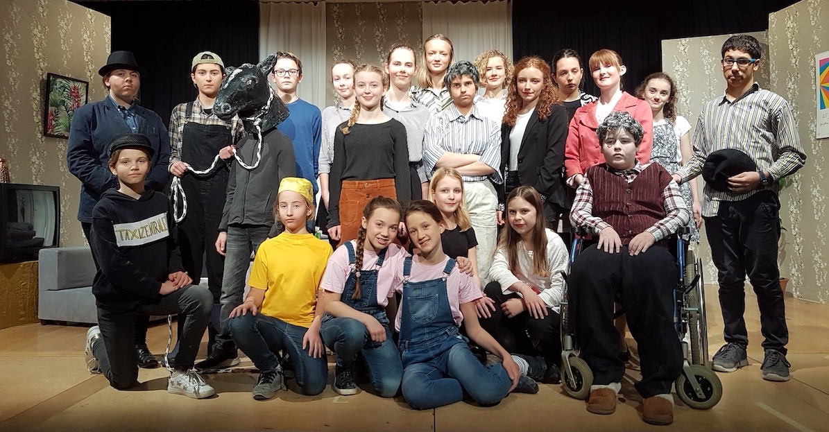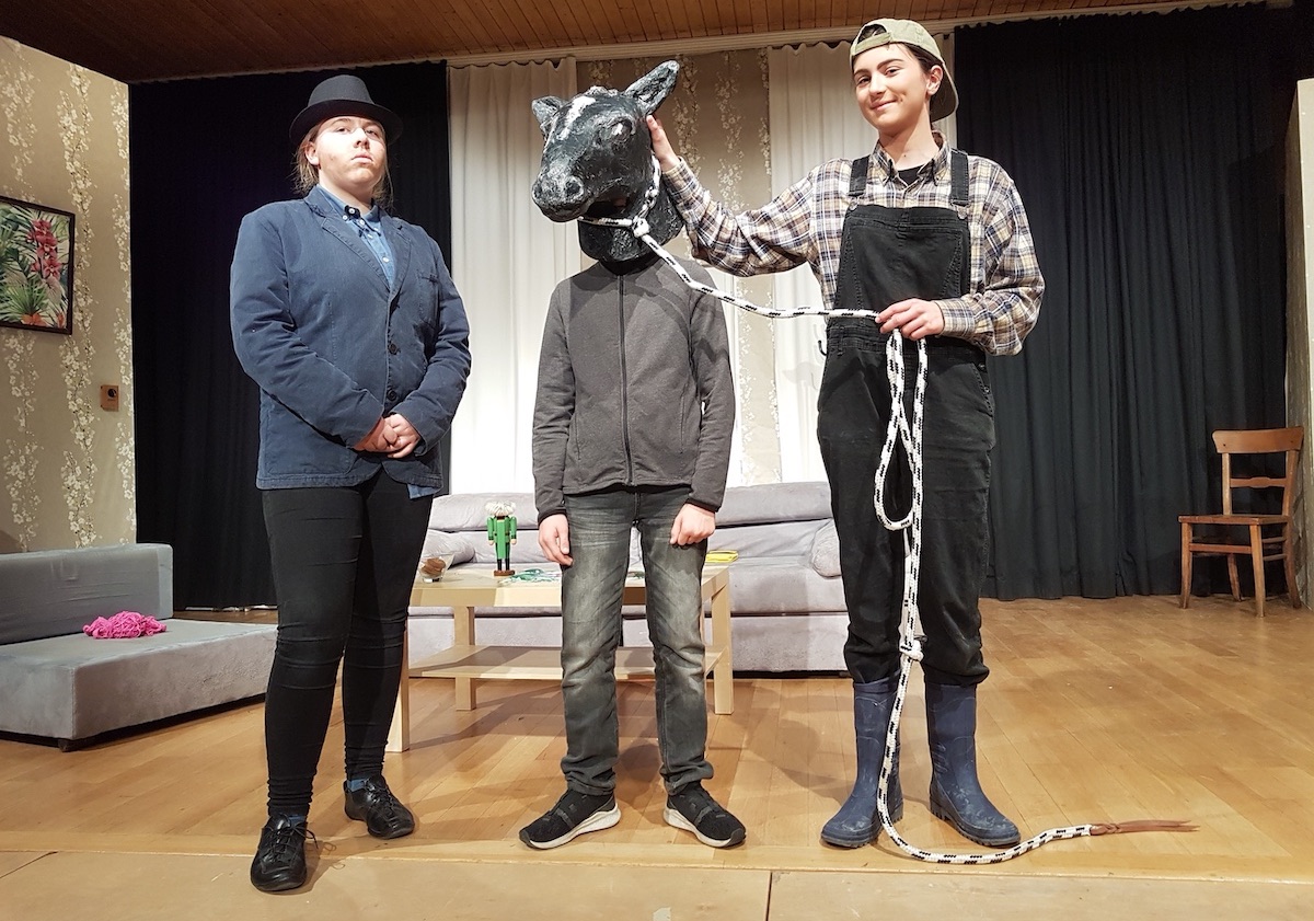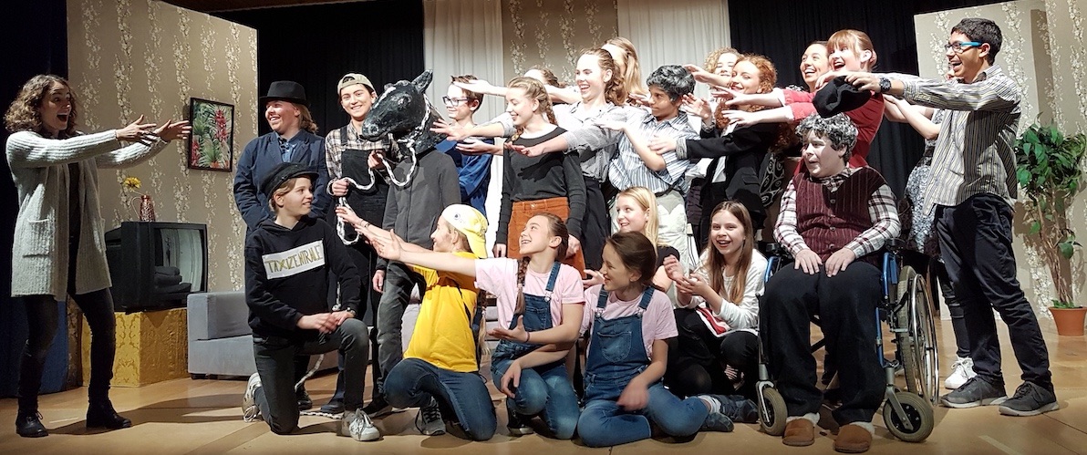 Rund 20 Schüler wirkten aktiv auf der Bühne mit und spielten witzig und begeisternd die unterschiedlichen Figuren – von der ewig gereizten Mutter, Frau Rabenstein-Regenpfeiffer (Emily Mayer, 9. Klasse) , die ihren alten Schwiegervater unbedingt loswerden will, über den beinahe stummen, an den Rollstuhl gefesselten, Opa Hugo Rabenstein (Matthis Kanele, 7. Klasse) bis hin zu dem Pferd/ Pony ( Luis Heneka, 7. Klasse) selbst, das, noch stummer als der Großvater, doch das Schicksal aller Menschen auf der Bühne mitbestimmte.