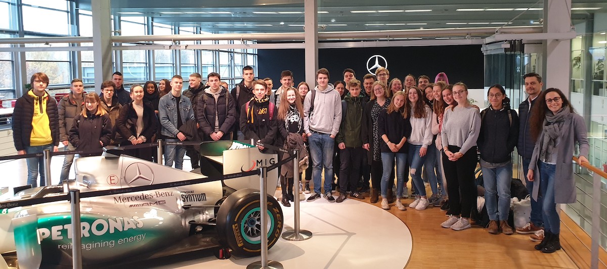Wie funktionieren wirtschaftliche Verflechtungen zwischen lokaler Stadtebene, der Region sowie rund um den Globus? Wo schlägt der Puls einer globalisierten Wirtschaft in der Region? Im Rahmen des zweistündigen Geographiekurses machte sich am 19. November die komplette Jahrgangsstufe 2 auf den Weg zu zwei Standorten, um diesen Fragen nachzugehen. So lernte eine Hälfte der Schülerschaft den Karlsruher Rheinhafen, die andere den Produktionsstandort von Mercedes-Benz in Rastatt kennen. Beide Exkursionen führten den Schülerinnen und Schülern nicht nur die unterschiedlichsten Aspekte von Infrastruktur, Handel und Warenproduktion vor Augen. Vielmehr standen die zukünftigen Abiturientinnen sowie Abiturienten inmitten zweier Industrielandschaften und stellten fest, dass auch eine Industrie 4.0 nicht ohne Raumbezug auskommen kann: Welche Flächen stehen zum Beispiel im Rheinhafen, fest eingebettet in das umliegende Ökosystem der Rheinauen, einem wachsenden Global Player der Recycling-Branche zur Verfügung? Welche Verkehrsadern verbinden Marseille mit dem Karlsruher Hafen und welche Bedeutung kommt dem Ölhafen auf nationaler Ebene zu?