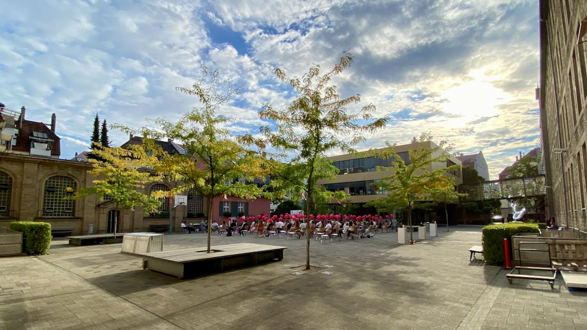 Anders als in normalen Zeiten fand die Feier im Schulhof des Lessing-Gymnasiums statt und anders als sonst war dies eine Feier mit zahlreichen Beschränkungen. Am schwersten wog sicher die Tatsache, dass die Eltern, Verwandten und Freunde der Abiturienten nicht dabei sein konnten. Stattdessen musste Abstand gehalten werden und dies gestaltet sich bei 81 KandidatInnen und all den Lehrern, die sie in den letzten Jahren begleitet hatten schwierig. Also schauten die Lehrer von den Fenstern aus zu und die Feier im Hof war bei unter blauem Himmel trotzdem eine gelungene und farbige Veranstaltung!