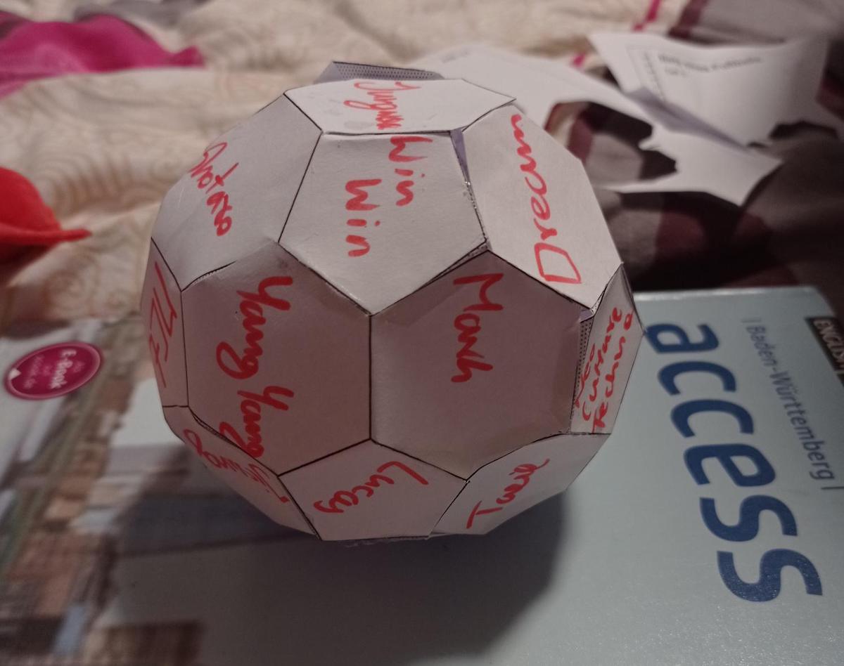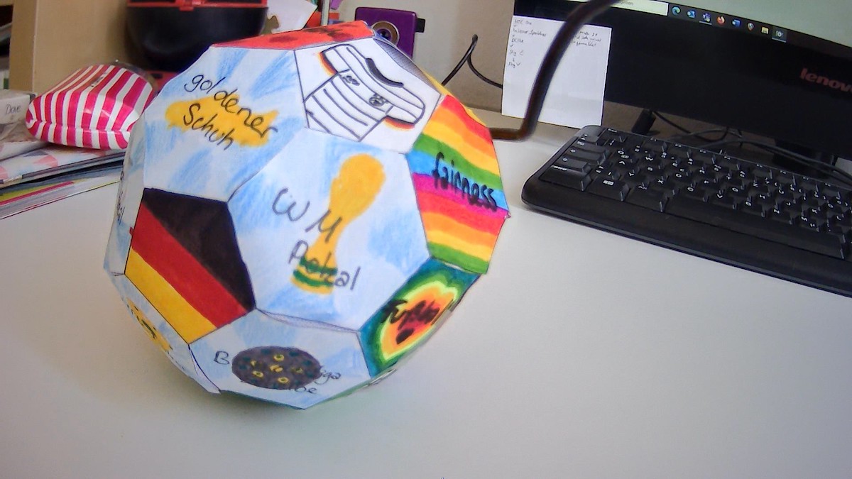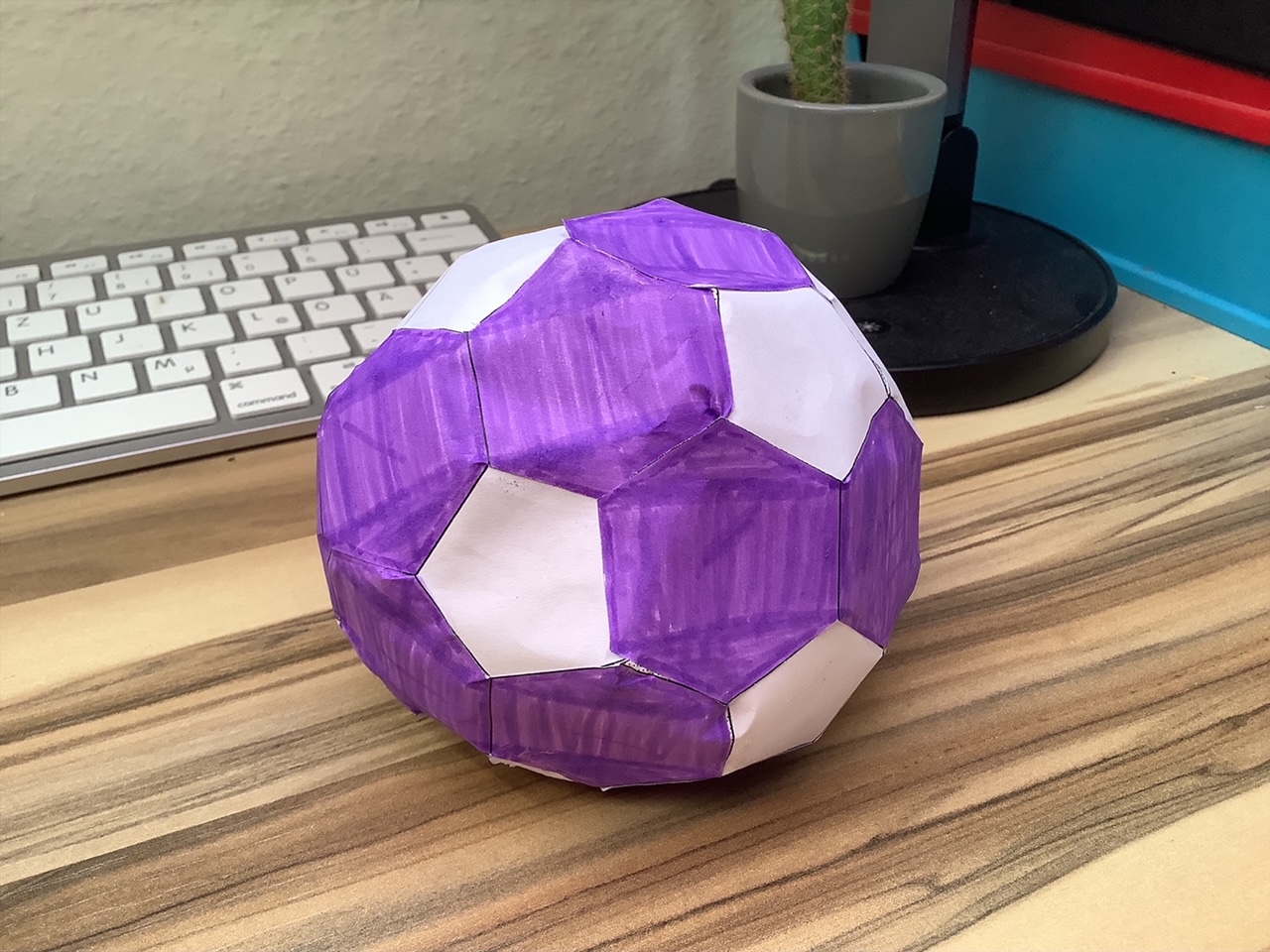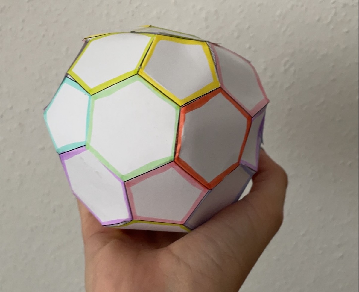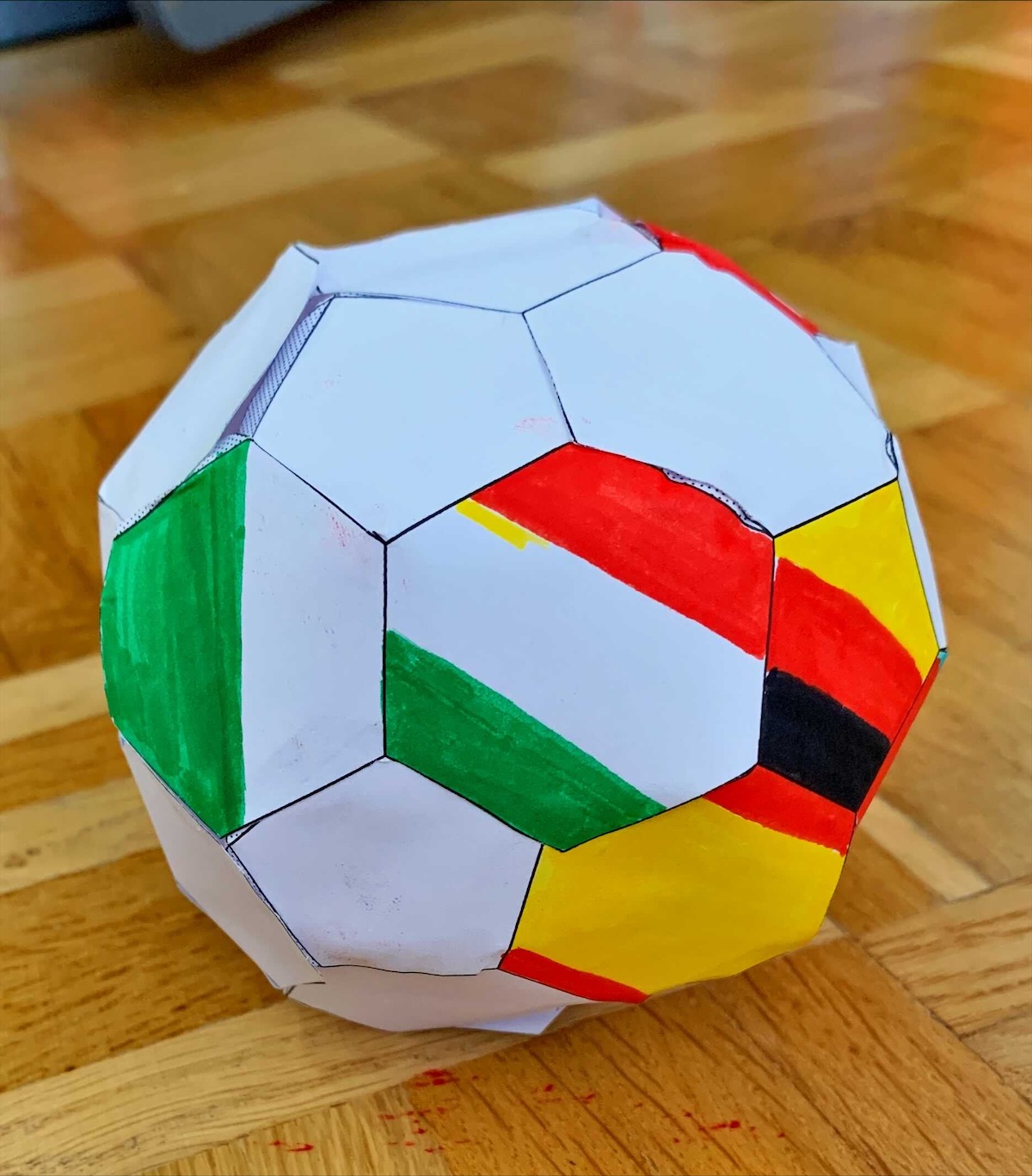 Die Klasse 7d hat sich im Mathematikunterricht mit der Frage beschäftigt, wie sich Fussbälle aus geometrischen Figuren aufbauen lassen. Einige Ergebnisse sehen Sie im Folgenden.