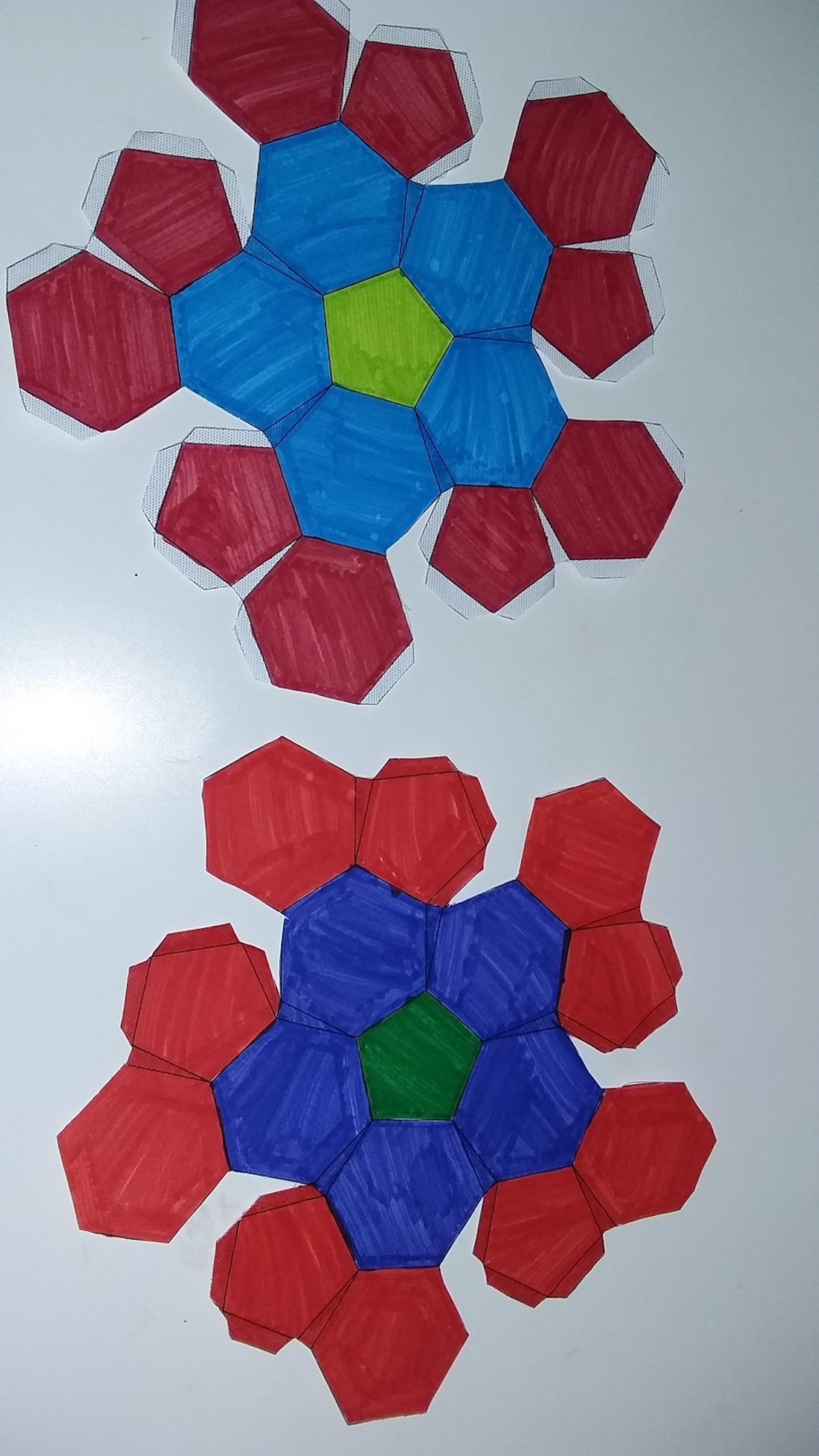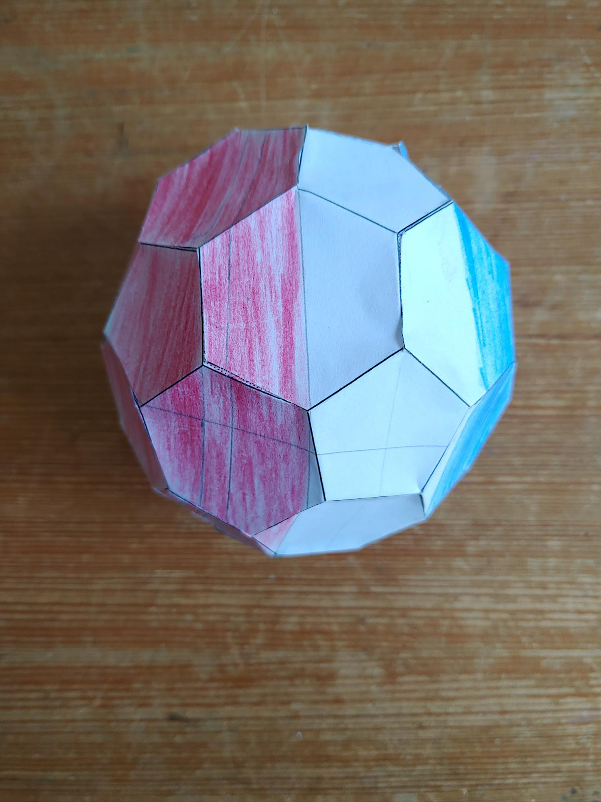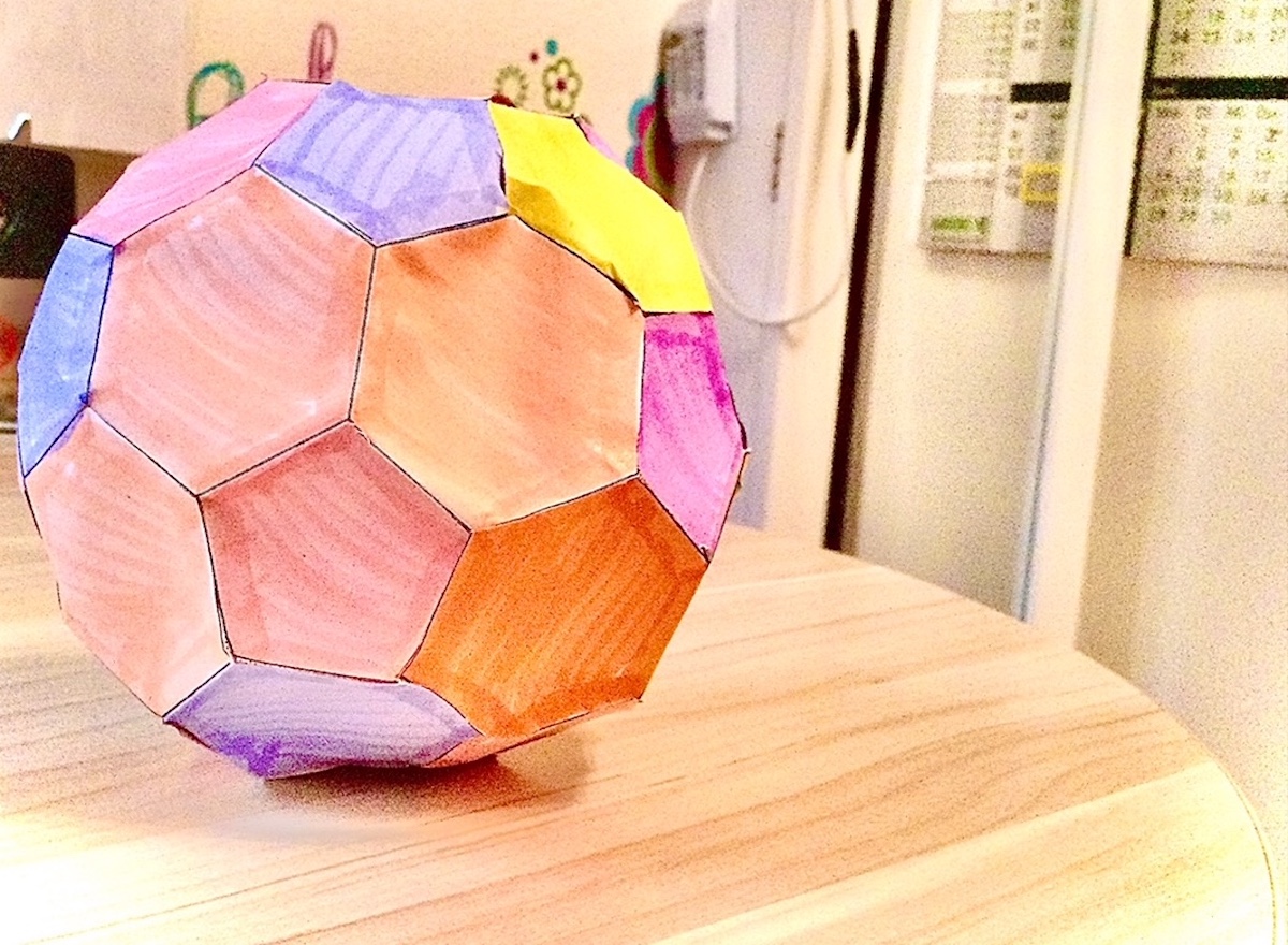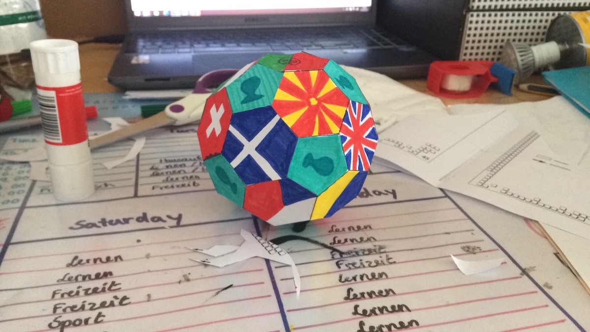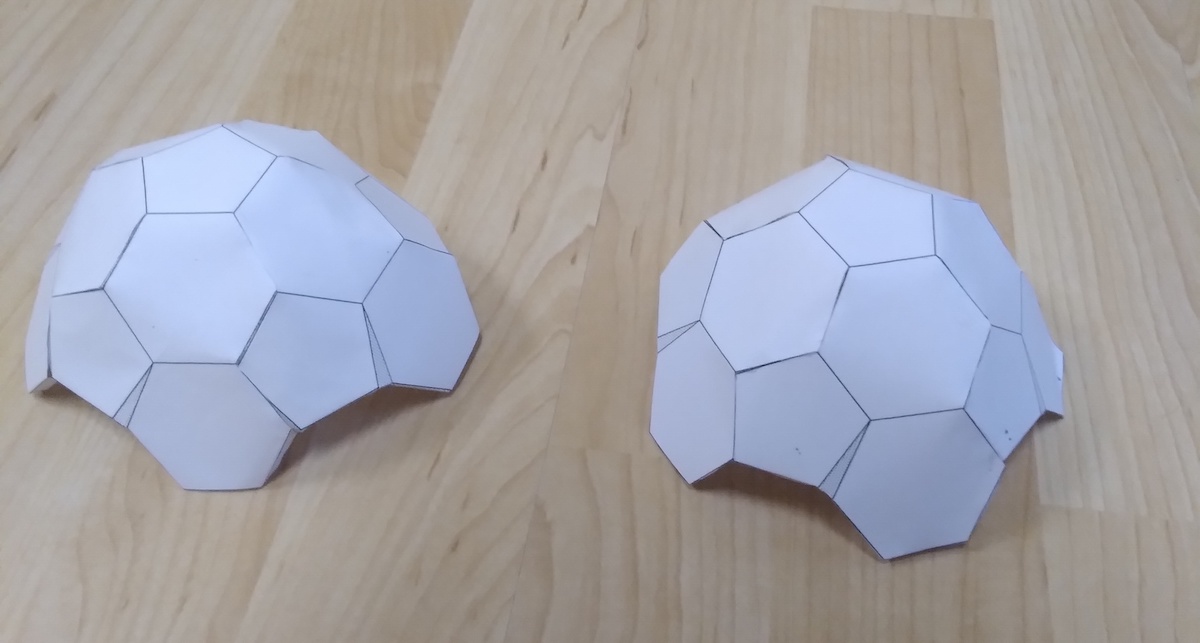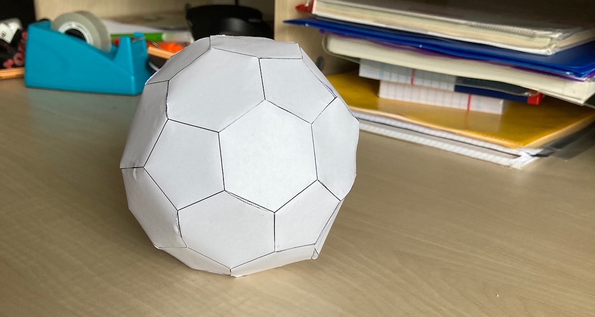 Die Klasse 7d hat sich im Mathematikunterricht mit der Frage beschäftigt, wie sich Fussbälle aus geometrischen Figuren aufbauen lassen. Einige Ergebnisse sehen Sie im Folgenden.