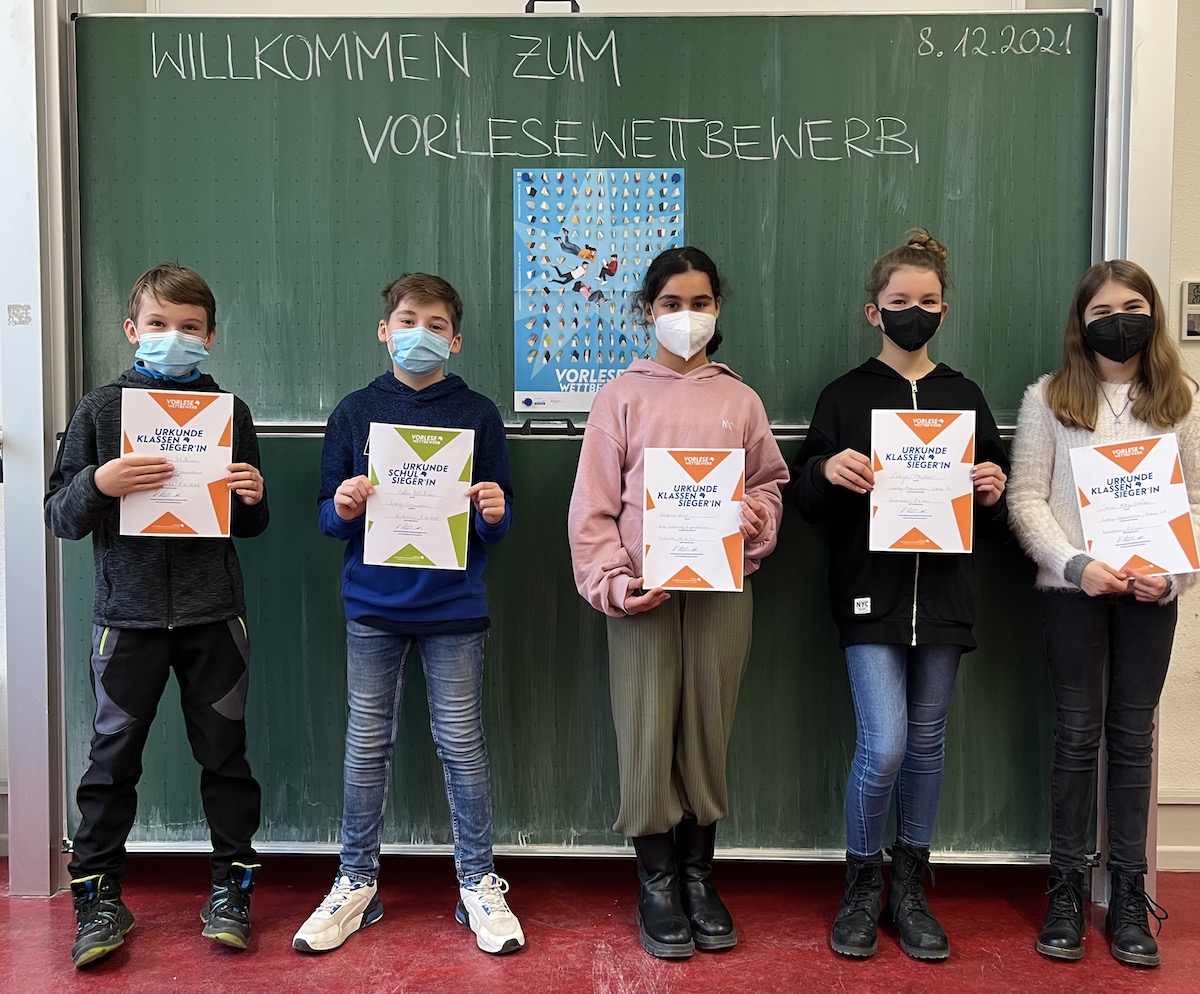 Allen Klassensiegerinnen und -siegern wurde in Gegenwart ihrer Deutschlehrer sowie Frau Seitz und Herrn Schneider, die beide die Schulleitung vertreten haben, eine Urkunde übergeben sowie ein Buchpreis. Und den Sieger melden wir gerne weiter für die nächste, stadtweite Runde in diesem insgesamt landesweiten Wettbewerb vom Börsenverein des deutschen Buchhandels. Dabei wünschen wir Oskar viel Erfolg!
