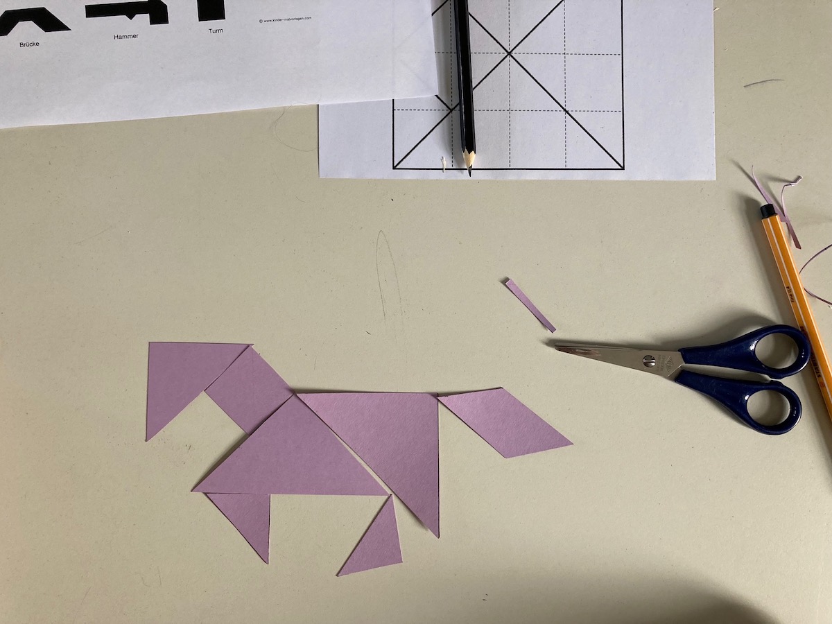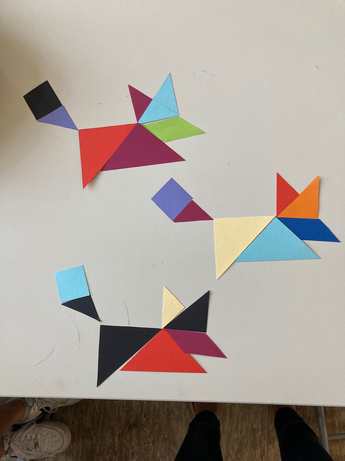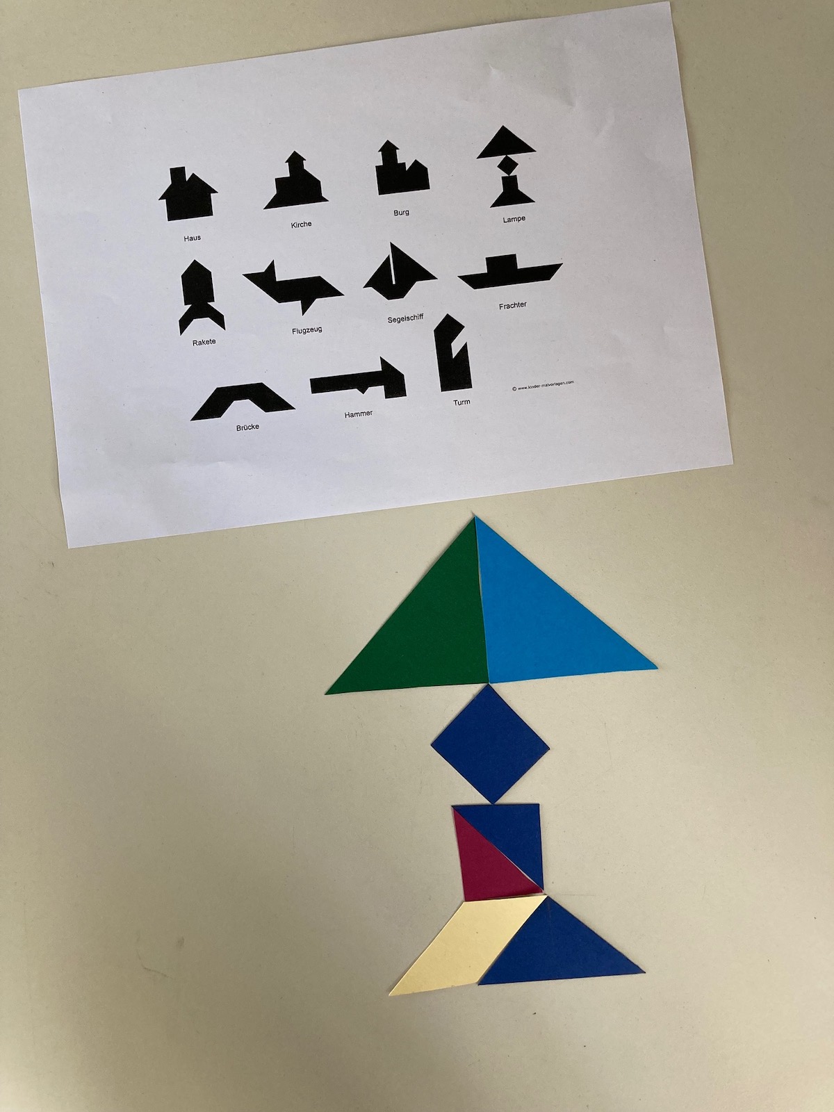 In unserer letzten Mathestunde vor den Ferien haben wir zunächst ein Tangram-Spiel aus buntem Karton erstellt und anschließend unsere geometrische Vorstellung durch Legen vieler unterschiedlicher Figuren trainiert. Gar nicht so einfach!