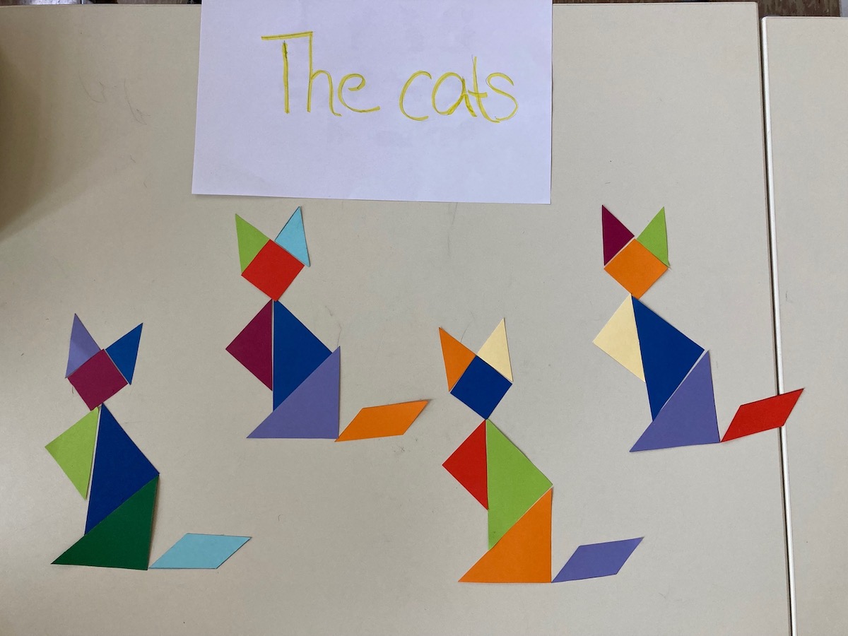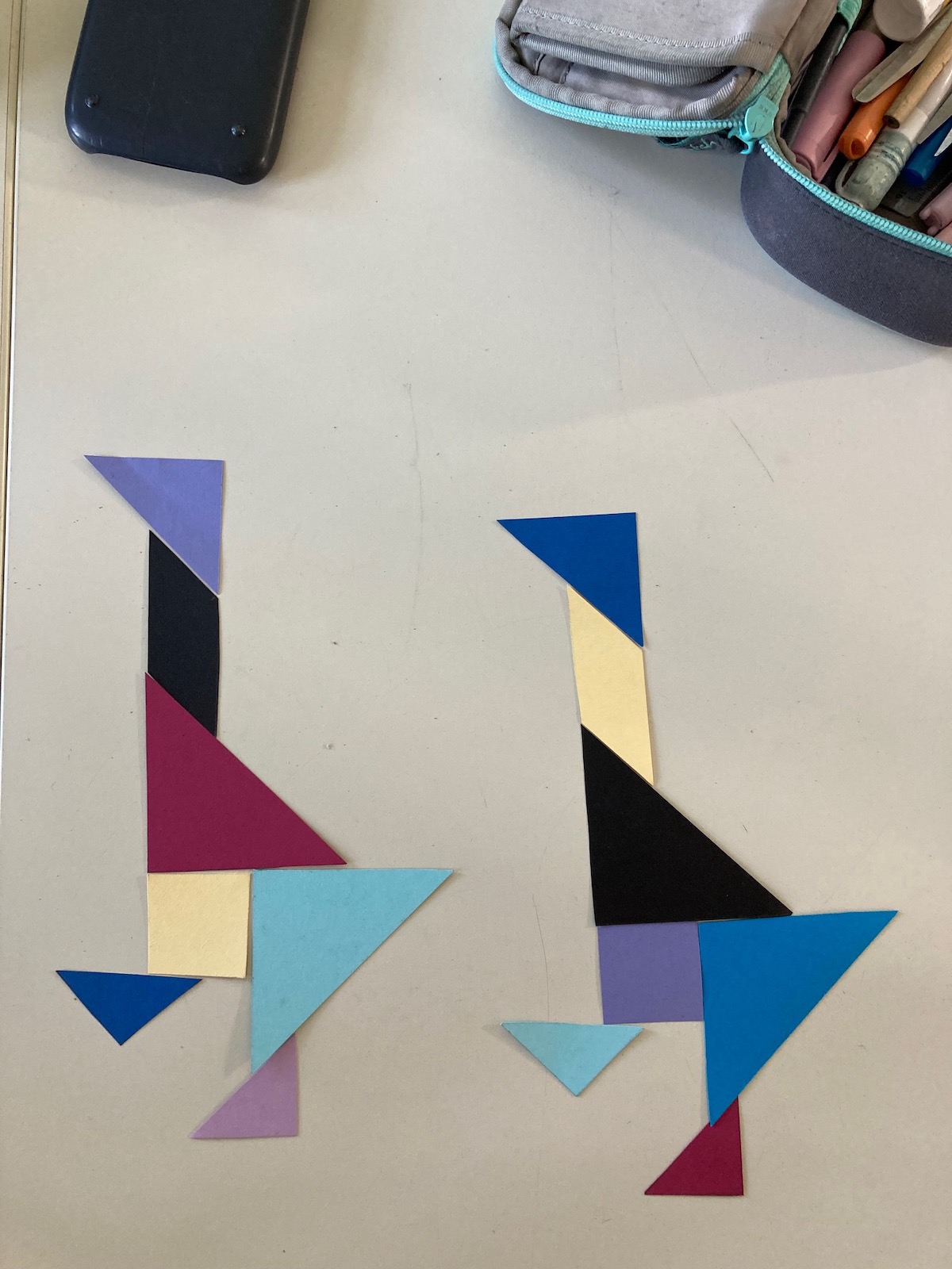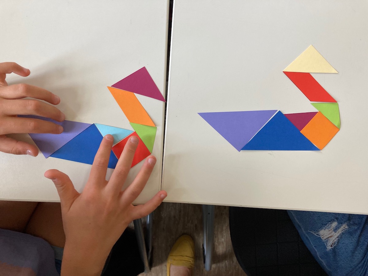 In unserer letzten Mathestunde vor den Ferien haben wir zunächst ein Tangram-Spiel aus buntem Karton erstellt und anschließend unsere geometrische Vorstellung durch Legen vieler unterschiedlicher Figuren trainiert. Gar nicht so einfach!