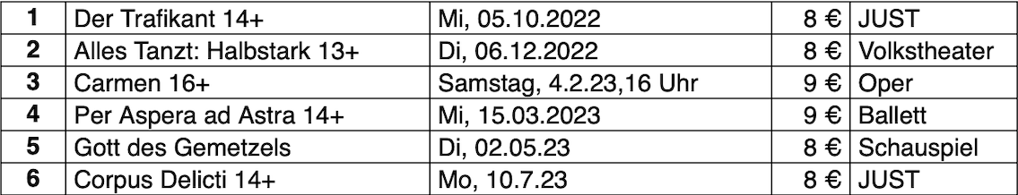 Frau Neumann ist zurück und bietet für dieses Schuljahr wieder ein freiwilliges Theaterabonnement ab Klasse 8 an. Wie die Teilnahme funktioniert, erfahren Sie im Folgenden.