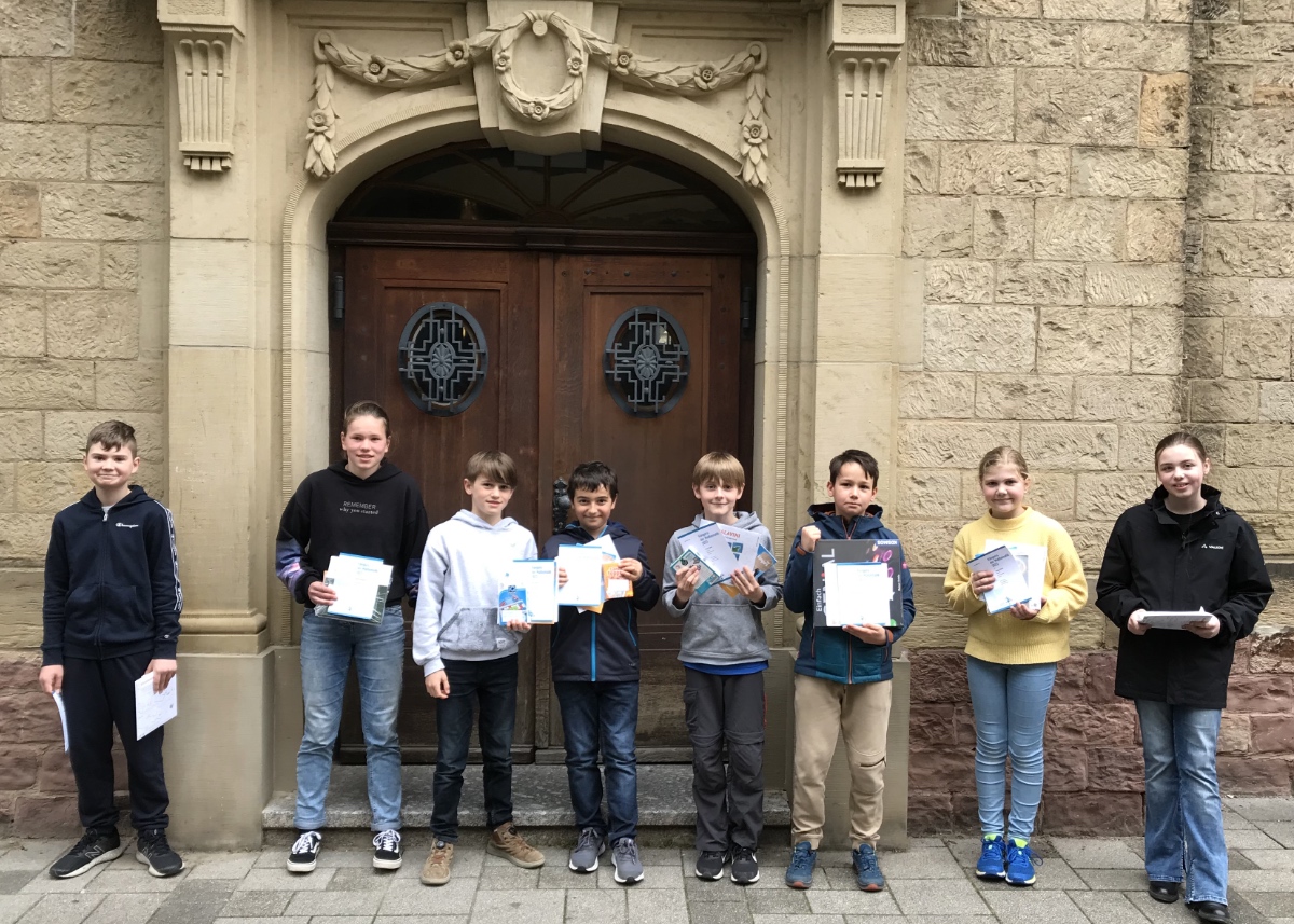 Tristan Hufer und Jonas Vogt aus der 5a zu ihrem 3. Preis, Tadeusz Kosek aus der 5b zu seinem ersten Preis, Jakob Göttert und Juliane Steiner aus der 5d zu ihrem 3. Preis, Mailin Deck aus der 6a ebenfalls mit einem 3. Preis, Carl Brunner aus der 6b zu seinem 1. Preis und Vincent Hamm aus der 6b zu seinem 3. Preis sowie Marika Prolingheuer aus der 9d zu ihrem 2. Preis.