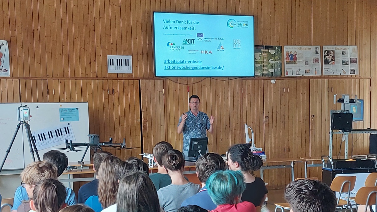 Schüler hinter dreibeinigen Vermessungsinstrumenten, ein 3D-Laserscanner, der den Musiksaal virtuell am Tablet originalgetreu nachbildet und Schülerinnen mit VR-Brillen - am Dienstag wurde die Aula des Lessing-Gymnasiums für alle Zehntklässler zum Ausstellungs- und Anschauungsraum für Vermessungstechnik. In der Aktionswoche der Geodäsie (https://aktionswoche-geodaesie-bw.de/infos-fuer-veranstalter) besuchten Vertreter des KIT, der Fachhochschule, des Berufsverbands, eines Ingenieurbüros sowie eines Herstellers für Messinstrumente das Lessing-Gymnasium.