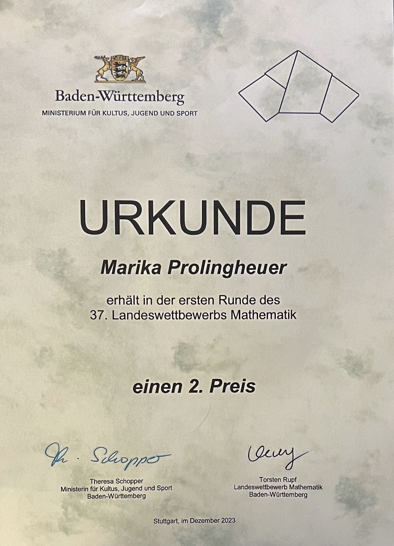 Zusammen mit der Kultusministerin Theresa Schopper und dem Leiter des Wettbewerbs Torsten Rupf gratulieren wird Marika Prolingheuer dazu, dass sie in der ersten Runde des 37. Landeswettbewerbs Mathematik einen 2. Preis erhalten hat. Herzlichen Glückwunsch! Marikas Urkunde finden Sie anbei.
