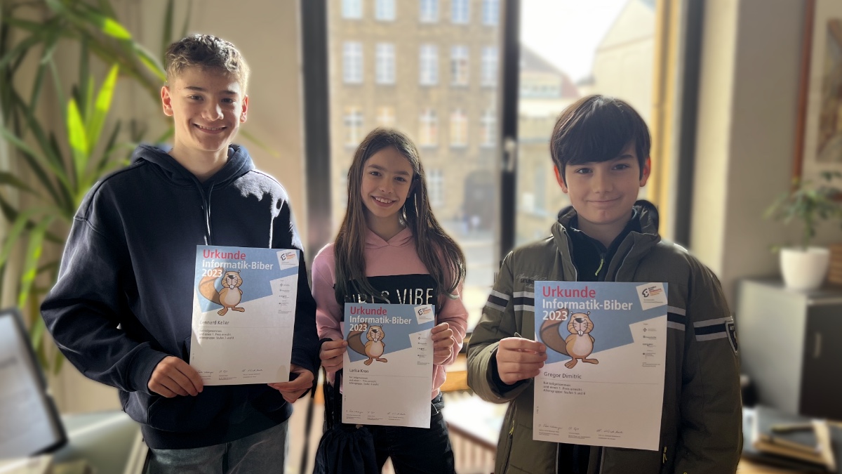 Beim diesjährigen Wettbewerb Informatik-Biber nahmen 97 Schülerinnen und Schüler aus den Klassen 5 und 7 teil - drei von ihnen waren ganz besonders erfolgreich und belegten jeweils den 1. Platz. Wir gratulieren Gregor Dimitric (5c), Larisa Kron (5d) und Lennard Keller (7c) zu dieser tollen Leistung!