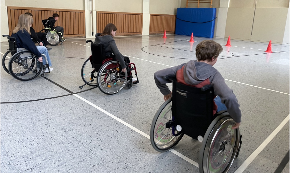 Anschließend konnten die Schülerinnen und Schüler selbst erleben, wie es ist, sich in einem Rollstuhl fortzubewegen. In der Turnhalle stand ein umfangreiches Rollstuhltraining auf dem Programm: Wettläufe, Hindernisfahren und Geschicklichkeitstraining gaben den Jugendlichen eine realistische Vorstellung davon, was es bedeutet, auf einen Rollstuhl angewiesen zu sein.