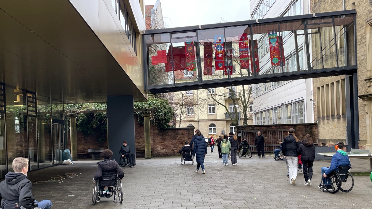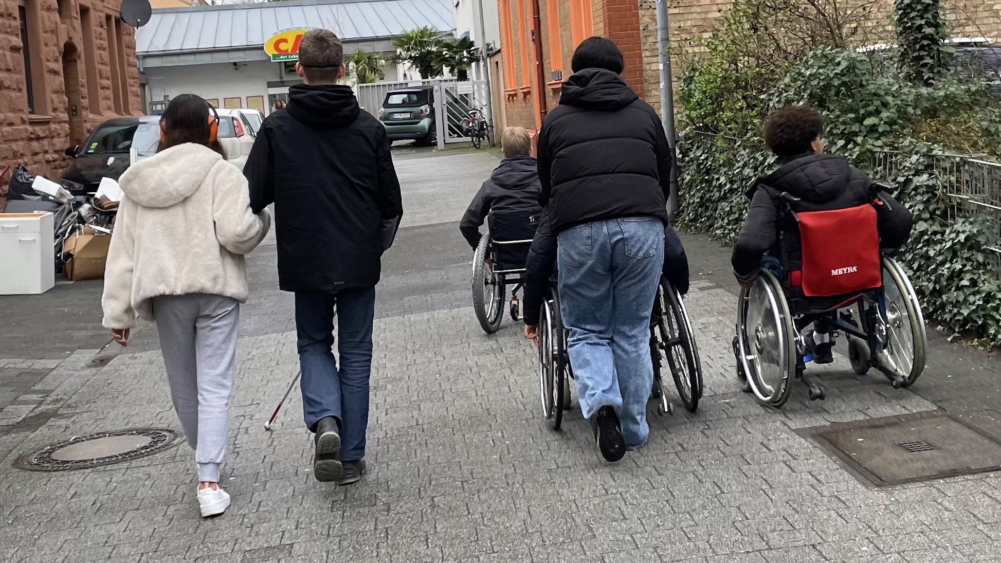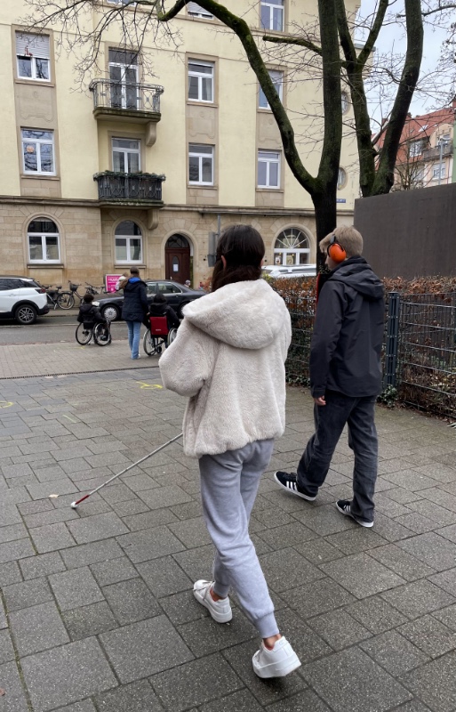 Am Nachmittag verließen die Teilnehmenden das Schulgebäude, um sich im Hof und in der Weststadt weiteren Herausforderungen zu stellen. Mit verbundenen Augen und Blindenstöcken, in Rollstühlen oder ausgestattet mit Gehörschutz versuchten sie, den Alltag auf den Straßen Karlsruhes zu meistern. Die Schülerinnen und Schüler rollten über das Kopfsteinpflaster des Gutenbergplatzes und manövrierten über Bordsteinkanten. Manche wagten sogar den Gang in die Bäckerei, wo ein Mitschüler dem „Nichtsehenden“ die Backwaren mündlich schmackhaft machen musste. Die Rollstuhlfahrer und -fahrerinnen scheiterten jedoch bei diesem Versuch bereits an der nichtvorhandenen Rampe.