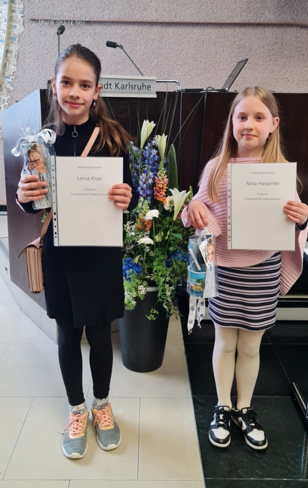 Die Schülerinnen Larisa und Nora erhielten für ihre Kunstwerke einen Preis, der ihnen bei der Preisverleihung am 08.05.24 im Karlsruher Rathaus überreicht wurde. Herzlichen Glückwunsch!