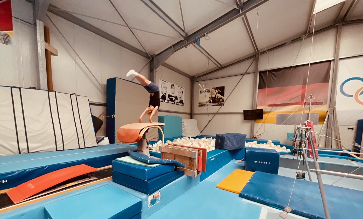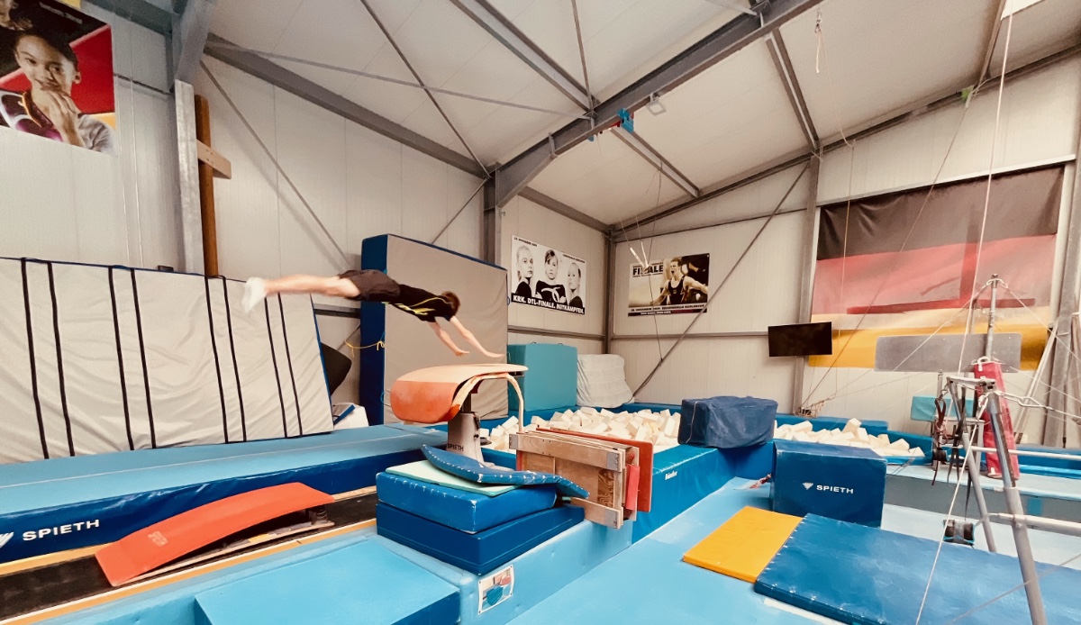 Durch die besonderen Gegebenheiten in Form einer Schnitzelgrube und eines Schwungbodens konnten die Schülerinnen und Schüler Übungen trainieren, die in der normalen Sporthalle nur schwer zu erlernen sind.